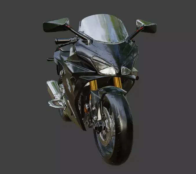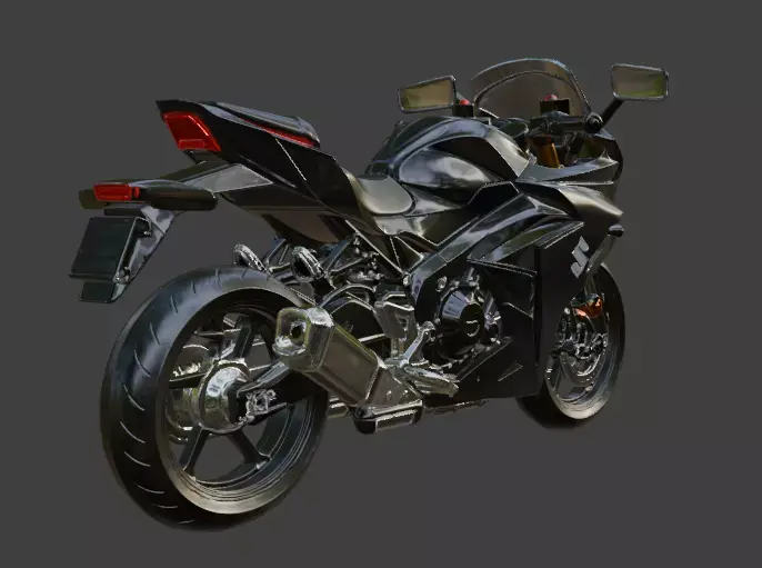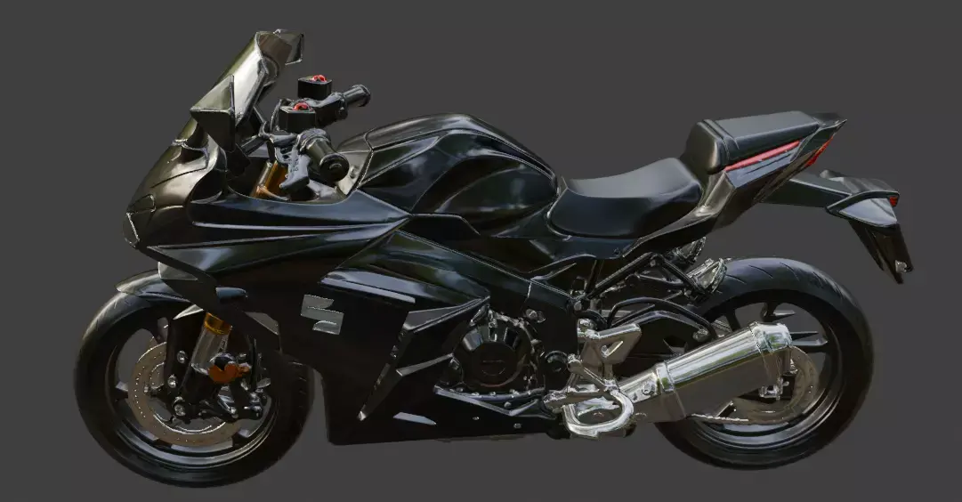 This is a detailed 3D model of a Suzuki motorcycle, showcasing a sleek black sport bike design with aerodynamic fairings, a comfortable seat, and a powerful engine. The model highlights the bike's sharp lines, chrome accents, and sturdy wheels, making it ideal for automotive renders, gaming assets, or design portfolios.