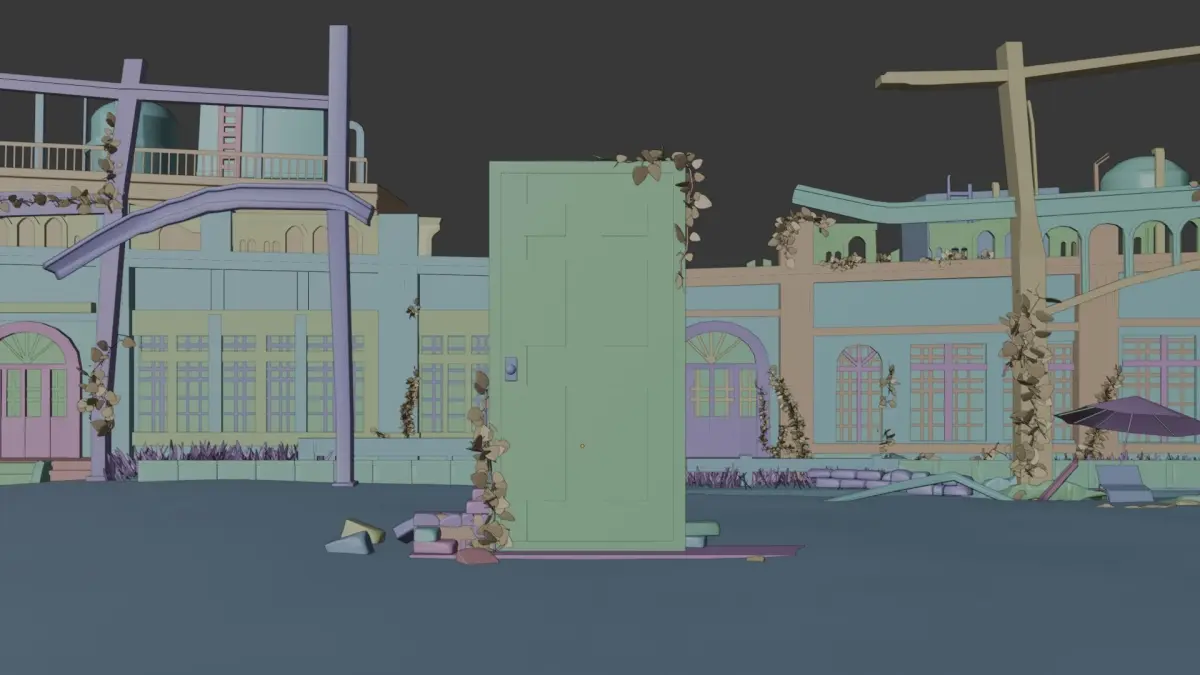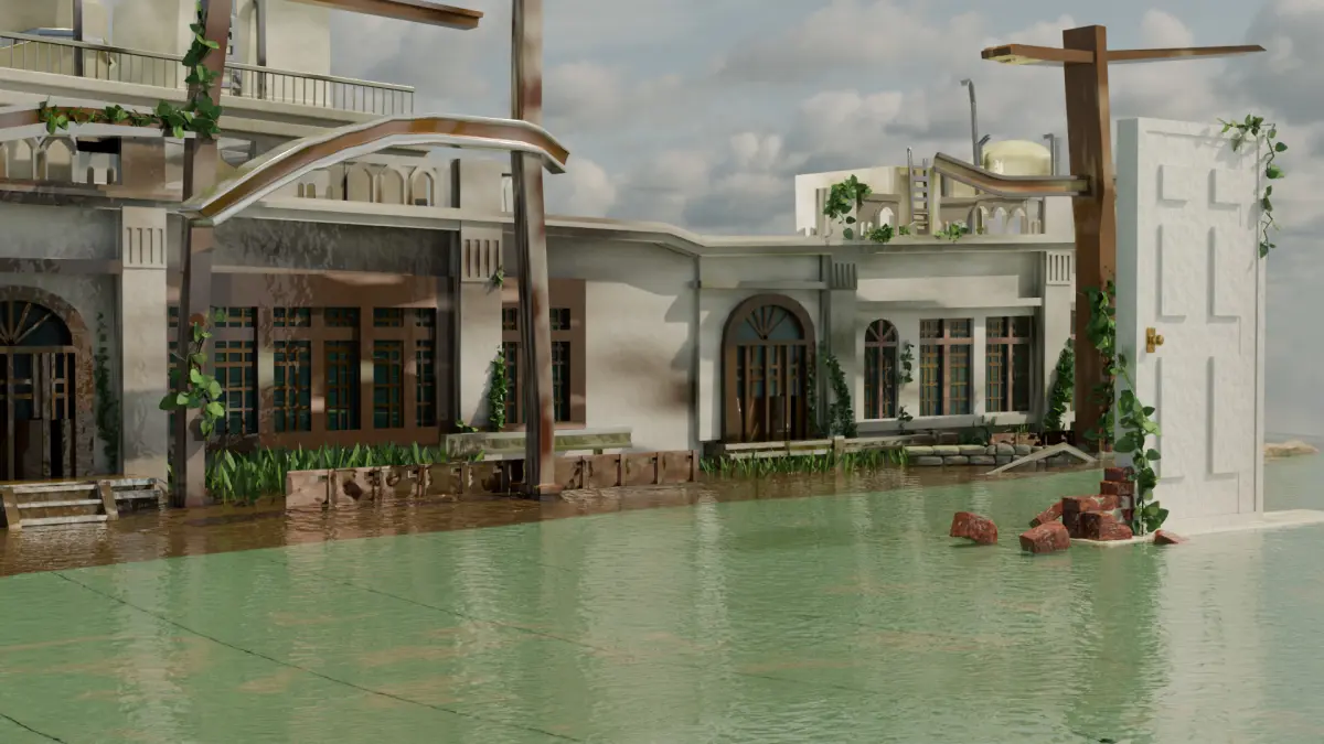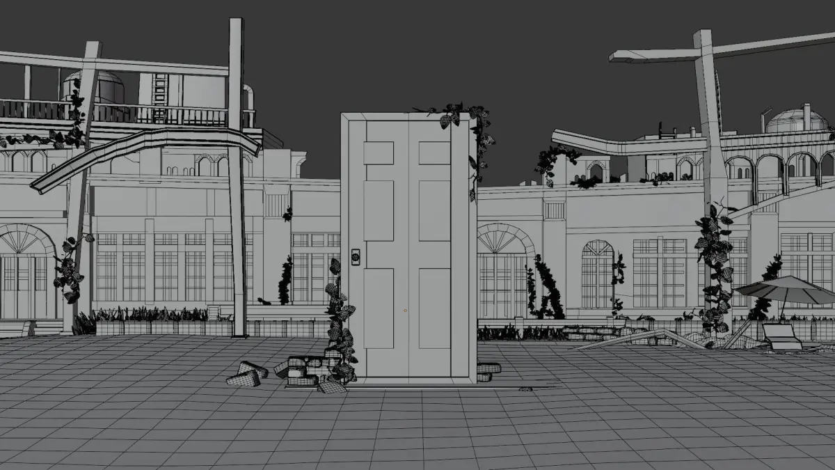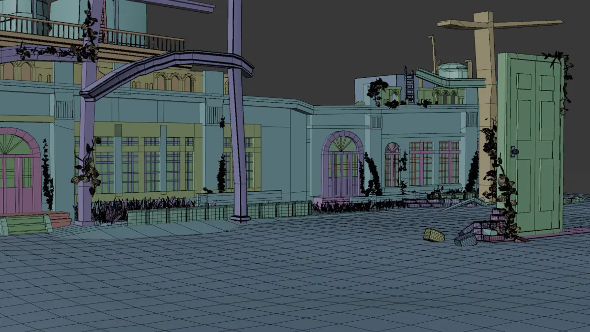 This 3D scene showcases a meticulously crafted environment of abandoned buildings, inspired by a scene from the anime - Suzume no Tojimari.