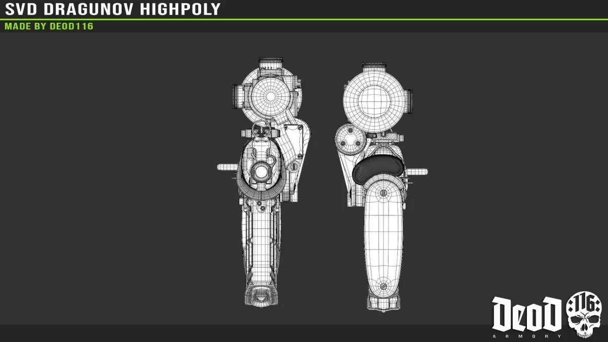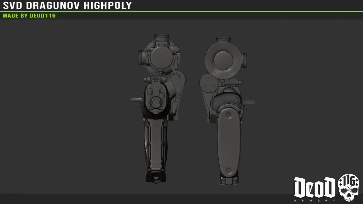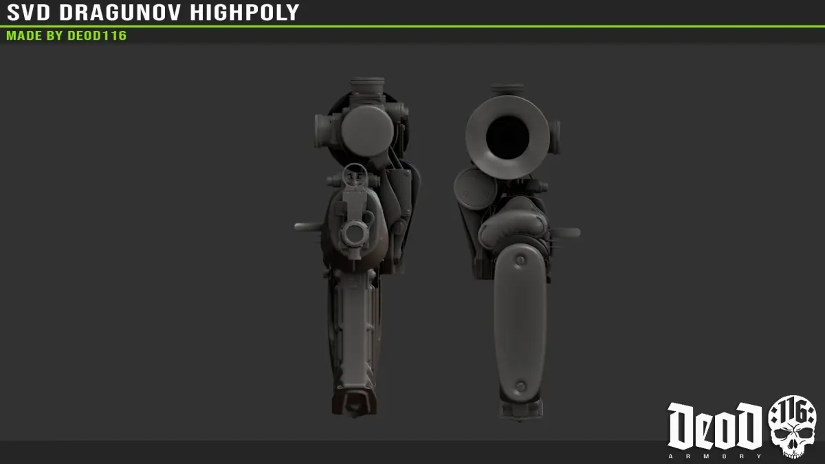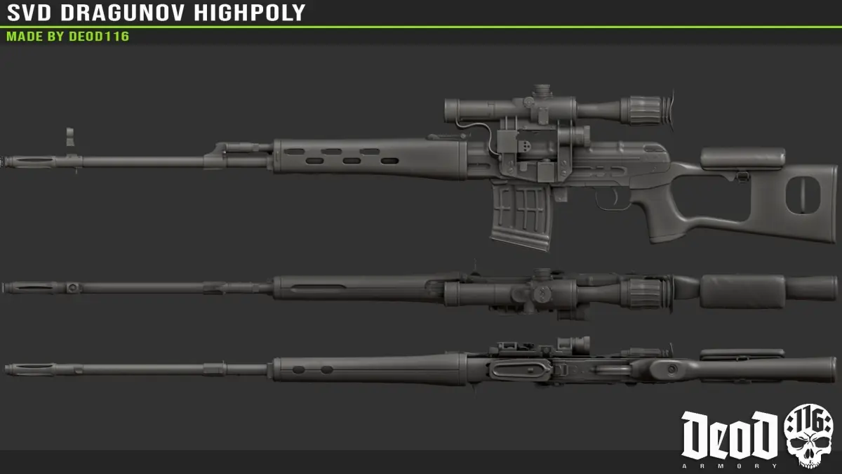 Highpoly model of SVD Dragunov: rifle, scope, cheekrest, magazine.Includes Blender source file, FBX set, OBJ set.