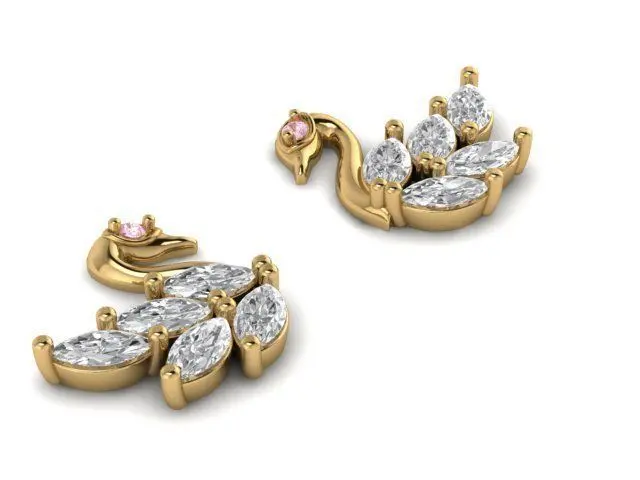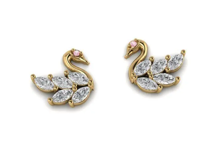 The Inspiration: The Golden Soulful Swan Earrings are inspired by swans, who mate for life. The Design: These golden earrings have a swan motifaed and pressure setting technique fuses four marquise and one princess cut diamonds to create an ideal solitaire-like look.