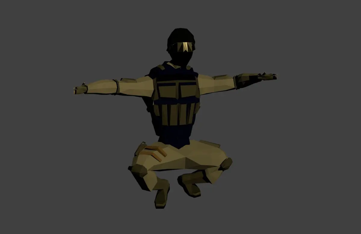 This 3d model is created in a blender. The model is suitable for games. It is animation and riged suitable for use in games for smartphones. the model has volumetric elements of clothing and low poly texture for low poly game. This model have animation fire and reload gun.