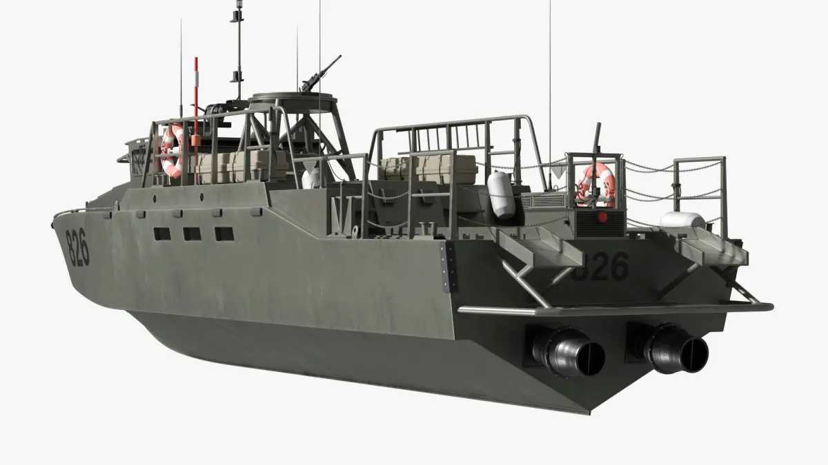 This highly detailed model features sleek, angular lines and a robust hull, optimized for speed and maneuverability. Equipped with defensive structures, antennas, and seating for crew members, it reflects the functionality and practicality of real-world patrol craft used in maritime security operations.