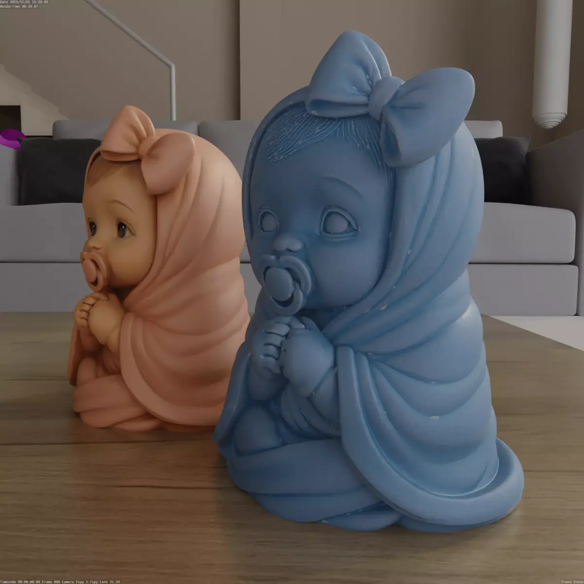 Design ConceptThe sweet baby figurine captures the essence of innocence and purity with its soft forms and cute details such as the pacifier and ribbon. It aims to evoke tender emotions and a sense of comfort.