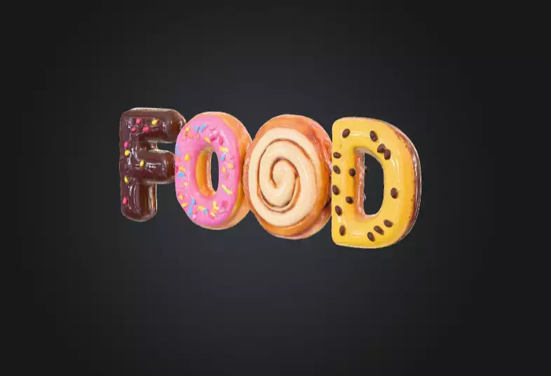The Sweet Treat Food Letters is a fun and eye-catching 3D design spelling out the word FOOD using colorful pastry-themed letters. Each letter is crafted to look like a delicious dessert: the F is a chocolate-covered pastry with rainbow sprinkles, the O is a classic pink frosted donut, the second O is a glazed cinnamon swirl, and the D is a golden cookie topped with chocolate chips.