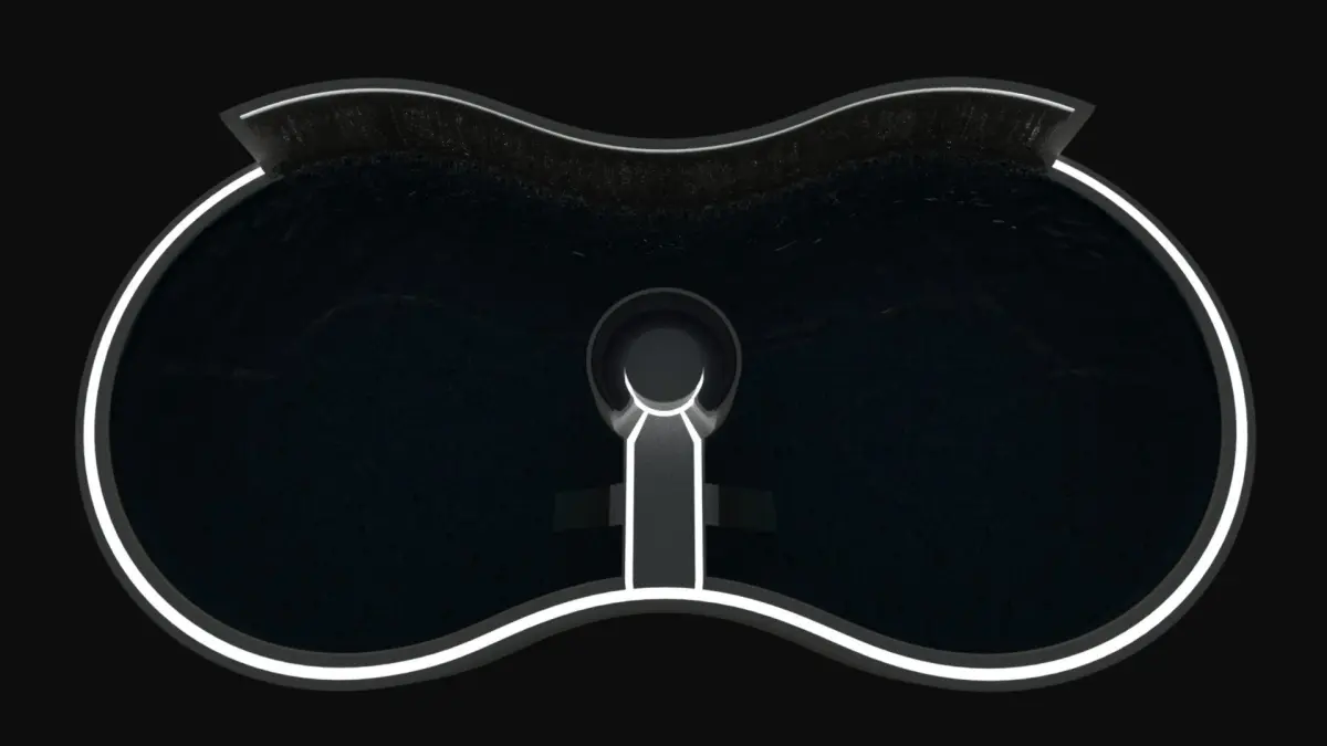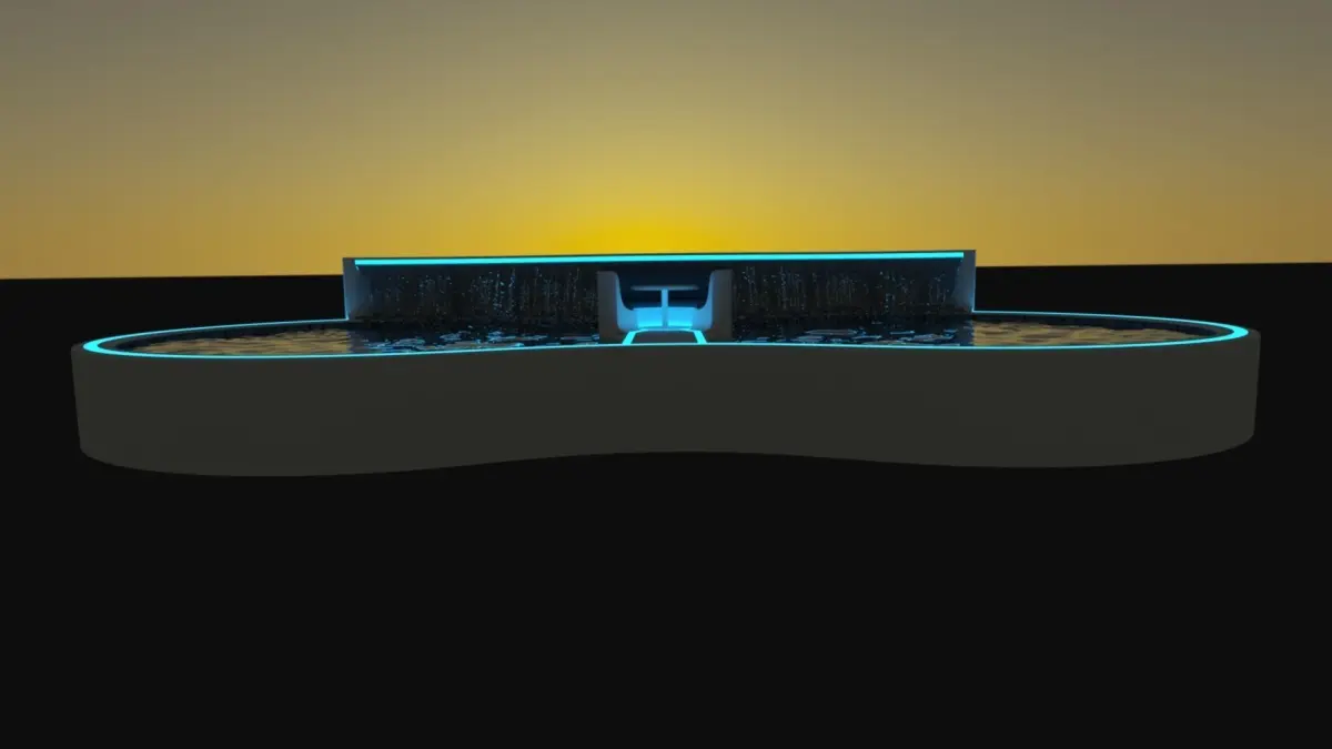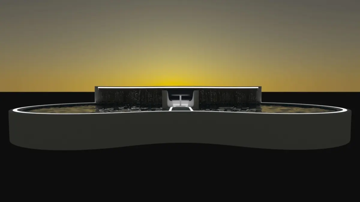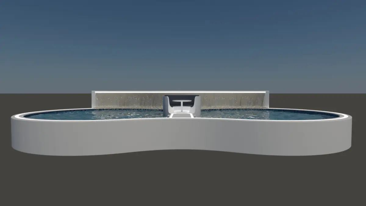 A large luxury swimming pool with central seating area in the middle of the pool and a rear water fall feature on the raised back wall of the pool.The whole pool and seating area are lined with a light strip to add a cool looking lighting feature.This is a very large swimming pool with two sets of stairs located other side of the walkway to the central seating space.Measurements are 1493cm long, 2992cm long and 455cm high.
