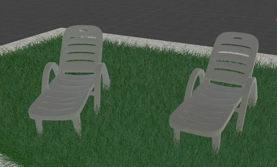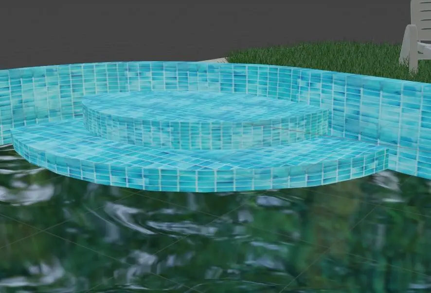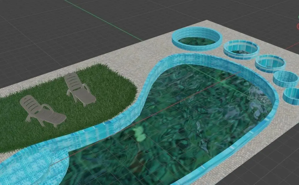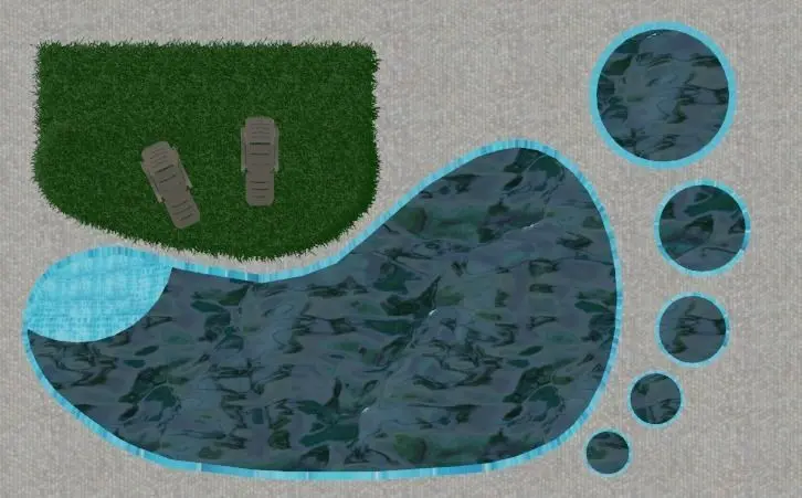 A scene with a swimming pool, two sun loungers, animated water and realistic grass. Swimming pool in the shape of a human foot. The area around the pool is light gray. Textures and materials have been worked out. For questions, write, I answer quickly.