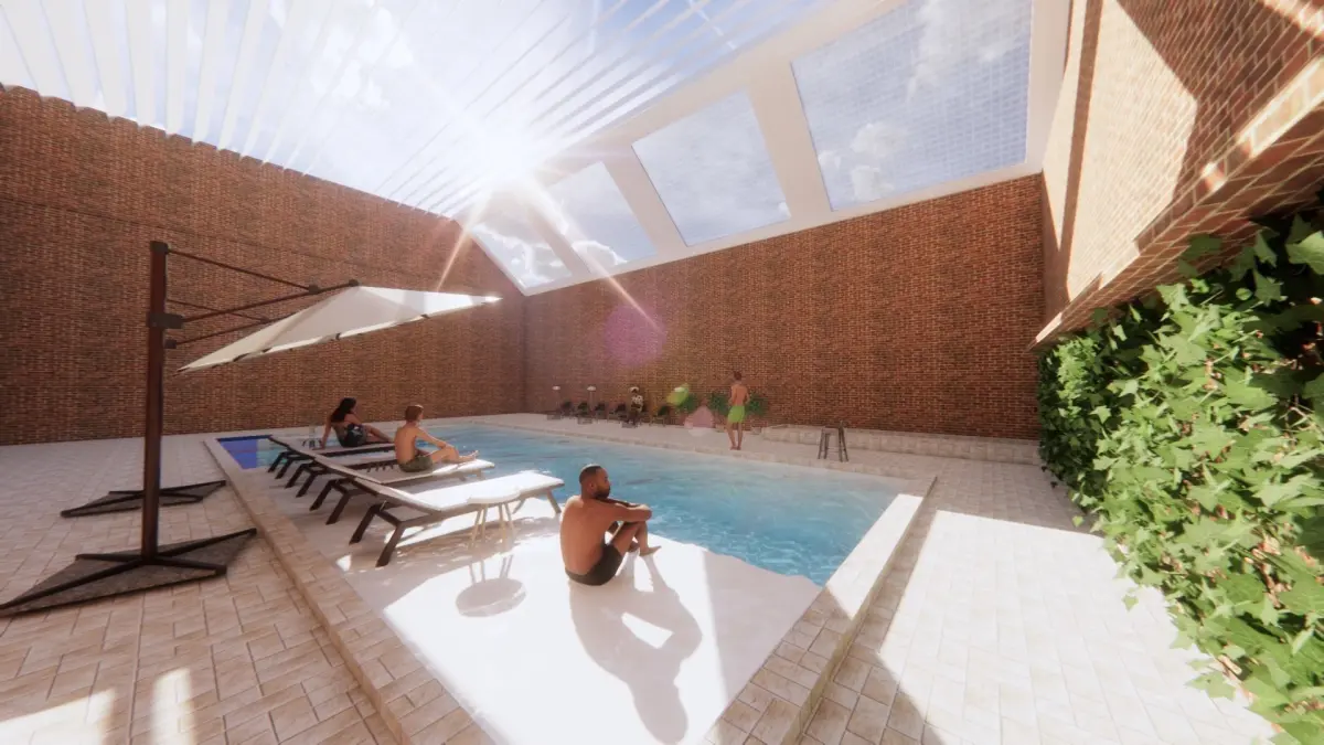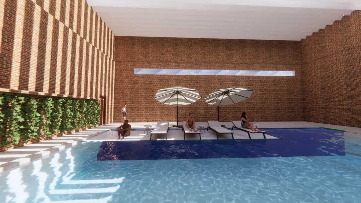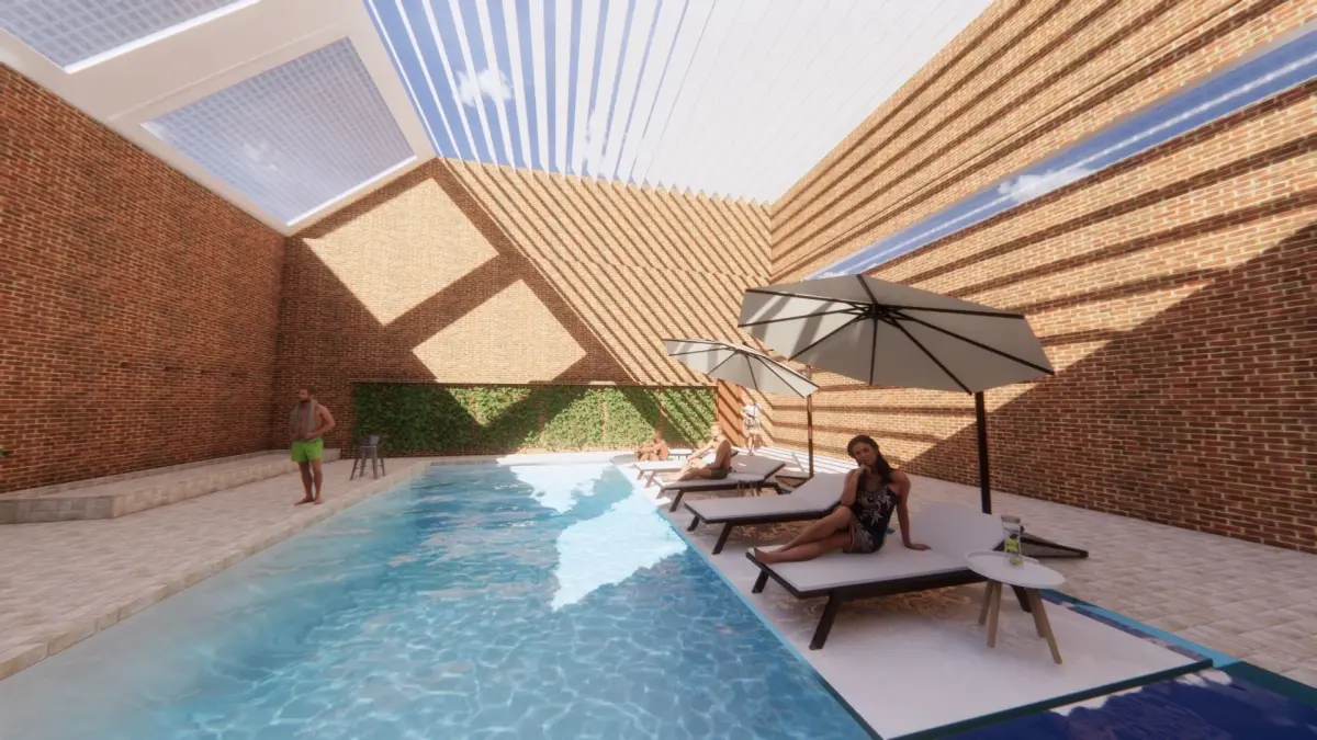 Rectangular swimming poolWalls with brick claddingHumans and furniture from EnscapeRendered in EnscapeThis model can be used as a sample pool design for aesthetical purposes to overview a recreational area with specific materials.