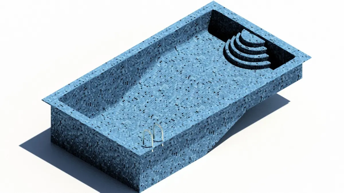 Swimming pool with semicircle steps in the shallow end of the pool and gold effect ladder steps in the deep end of the pool.One meter deep an the shallow end of the pool and 2 meters in the deep end of the pool.The swimming pool is finished in small bule mixed tiles.Dimentions 924cm long, 526cm wide, 200cm high.
