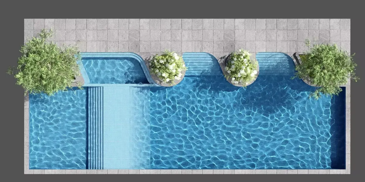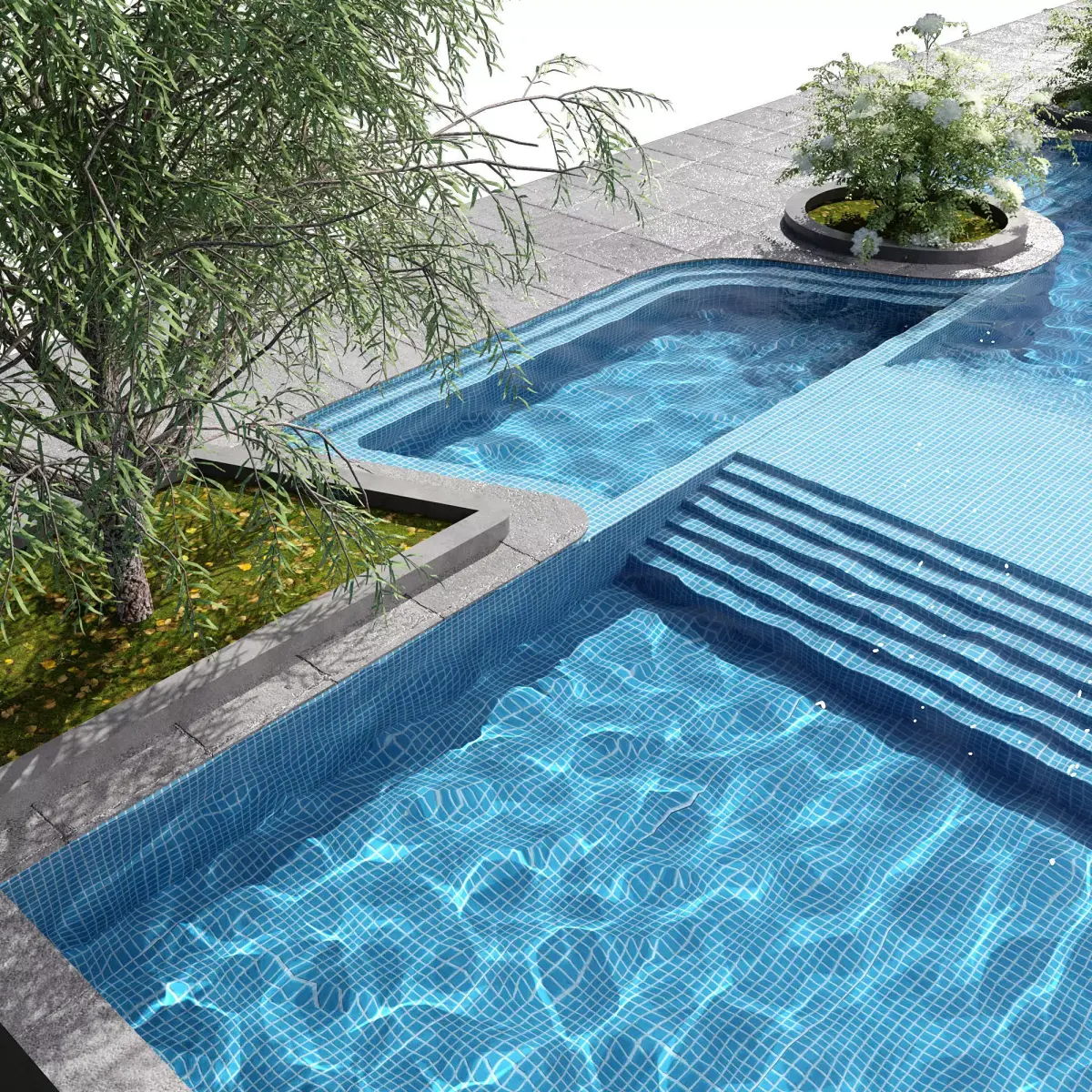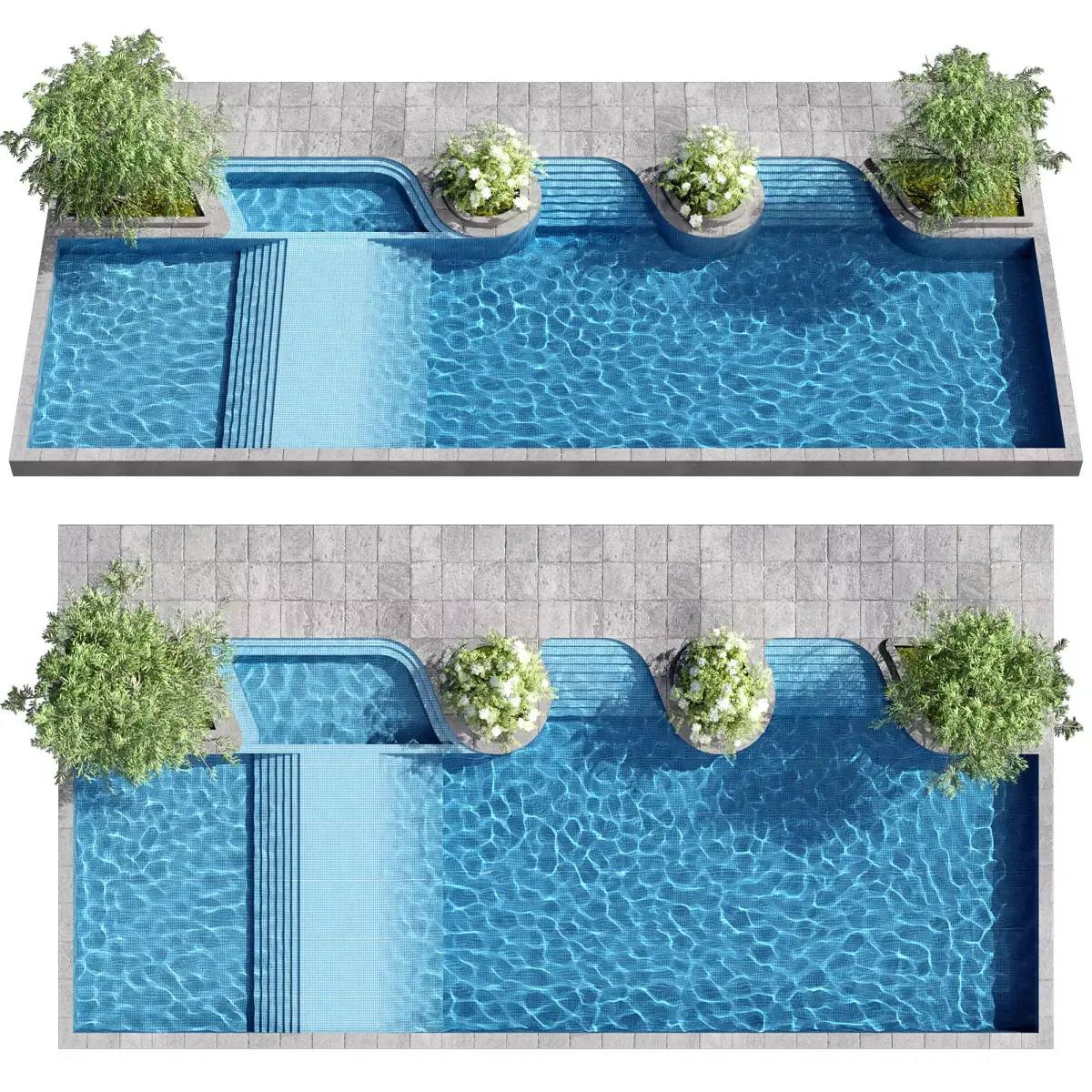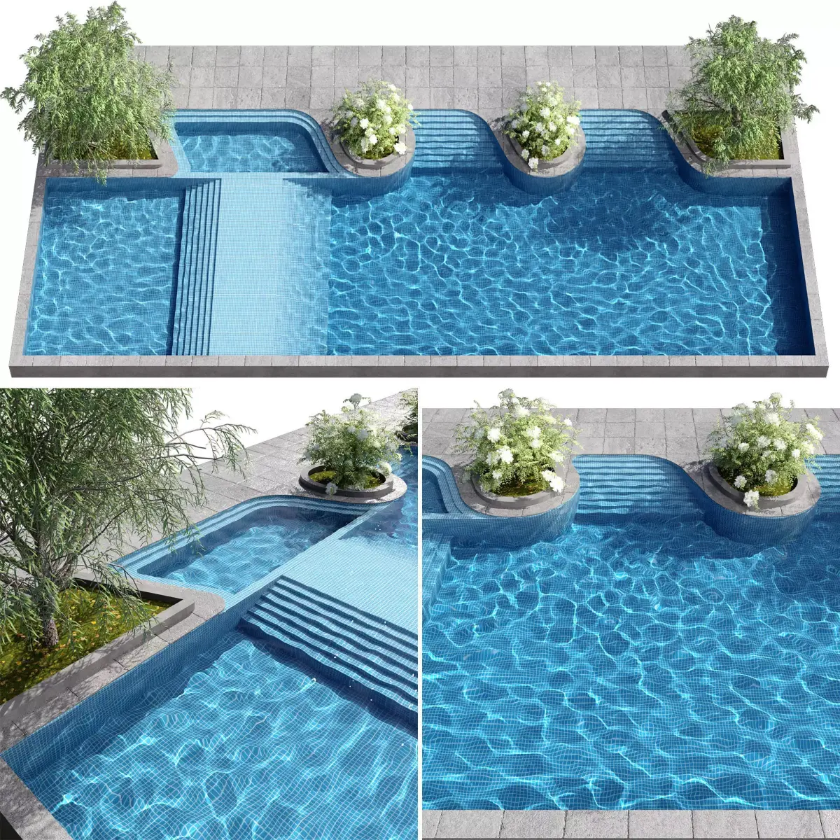 High-quality 3D model of a modern outdoor swimming pool featuring integrated circular and rectangular planters with realistic vegetation. The scene includes detailed water surface, tiled steps, and surrounding pavement. Ideal for landscape design, architectural visualization, and luxury exterior scenes.