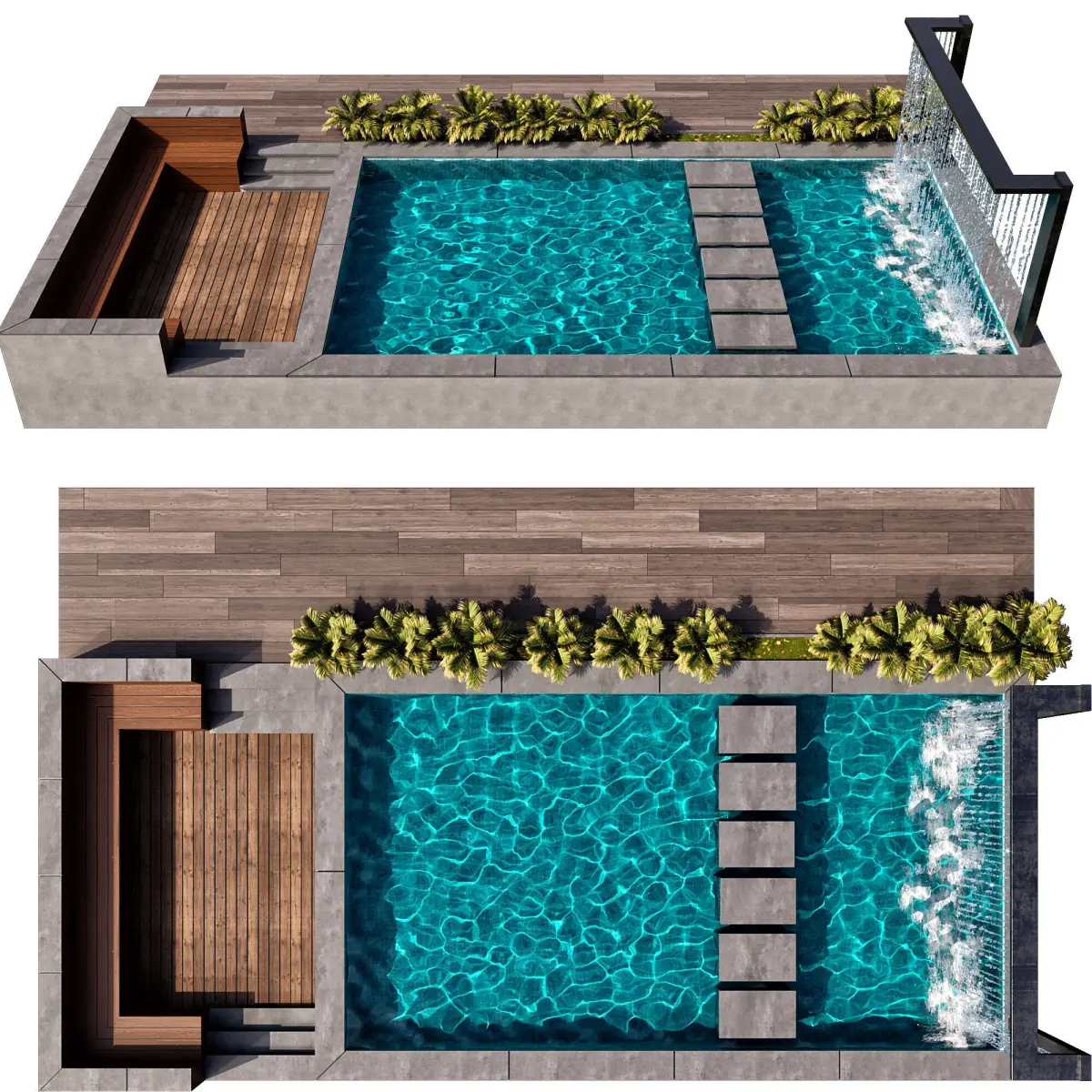 the landscape includes plants, landscape and pool