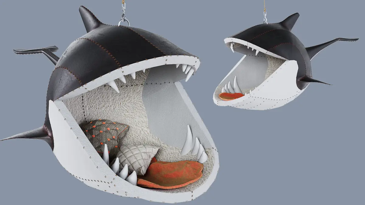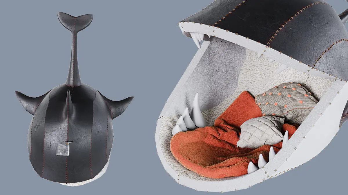 PORKY HEFER DESIGNS CRAFTED NESTS INSPIRED BY KILLER WHALES AND OTHER MARINE CREATURESSouth African designers Porky Hefer created hanging seatings inspired by marine creatures. The series supports local makers with an environmental message.Fiona Blackfish is a killer whale shaped hanging chair made with stitched black and white leather covering the external parts. The design is completed with tail and a full set of fins and flippers. A fluffy pink tongue is surrounded by leather cushion-teeth.The collection is hand made using the skills of local craftsmen starting from the weaving process that was carried out by Cape Town Society for the Blind.