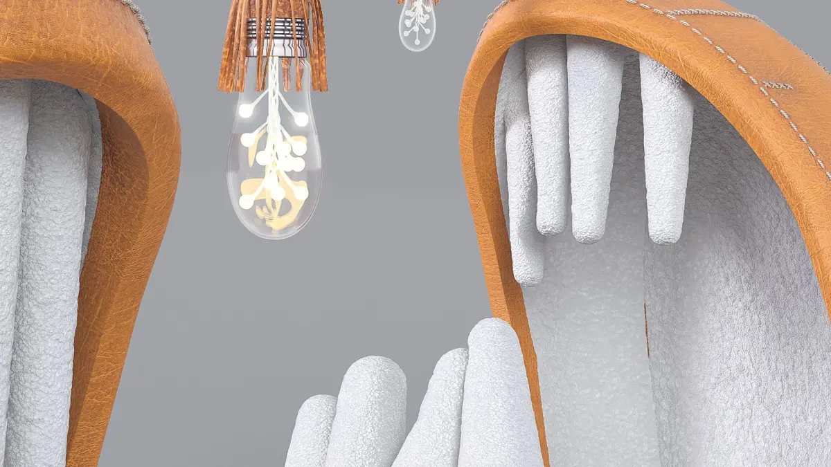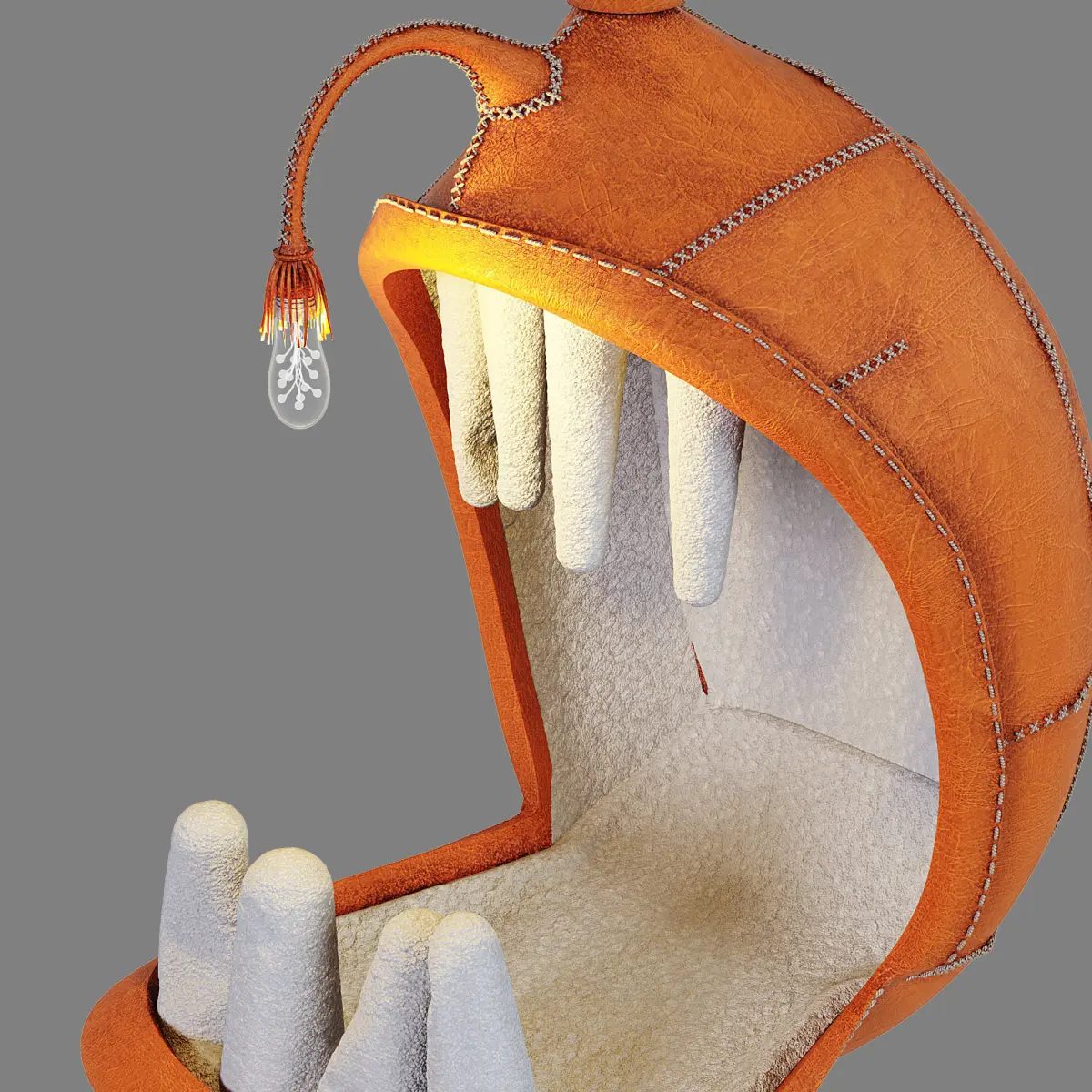 The anglerfish inspired seating is made with brown leather and has a set of big and soft white teeth. The abyss creature is provided with a luminous lure hanging above the mouth like a fishing rod. Porky Hefer has trasformed the lure into a lantern.The collection is hand made using the skills of local craftsmen starting from the weaving process that was carried out by Cape Town Society for the Blind.