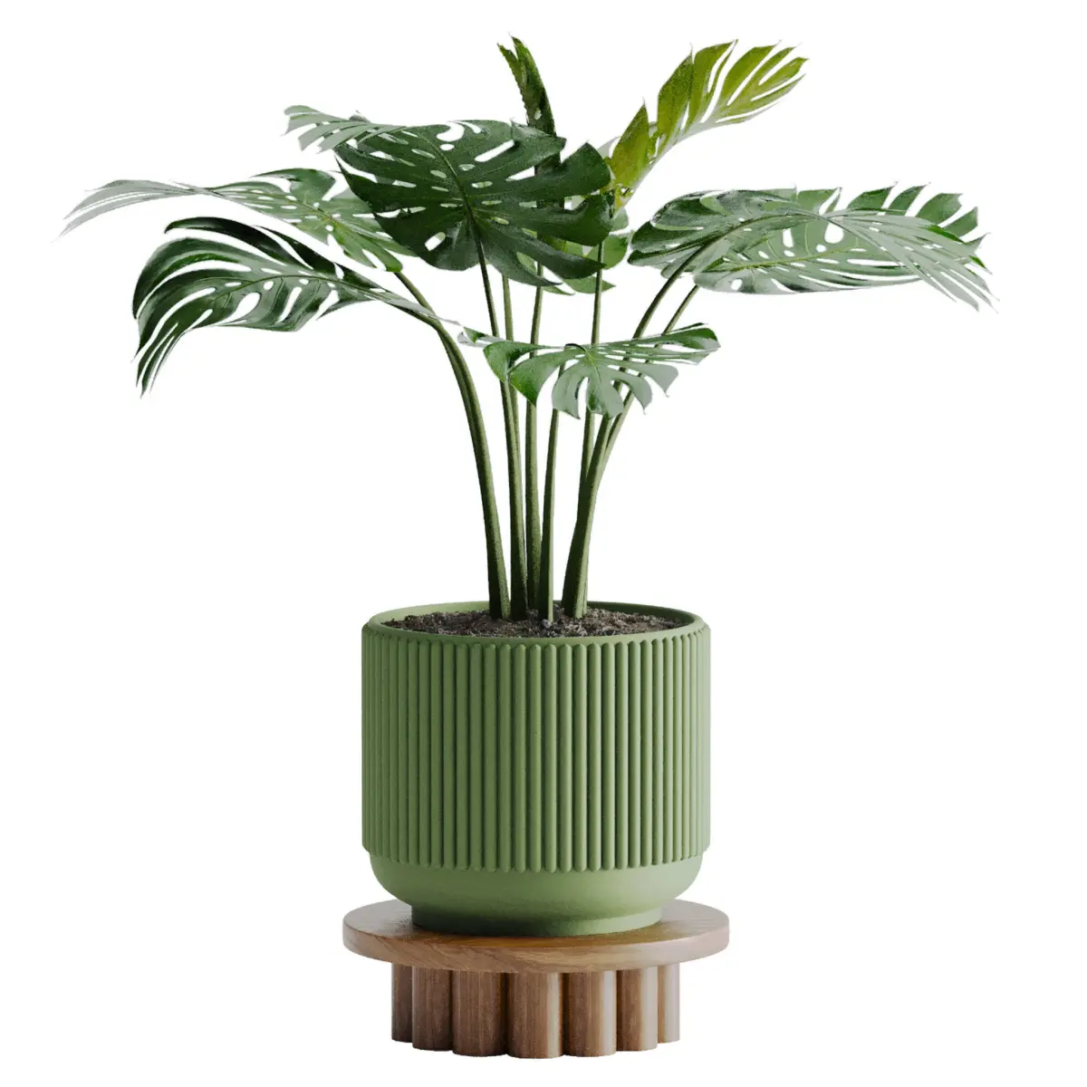 Single green pot on a wooden stand with Swiss cheese plants modeled in 3Ds Max 2017 and rendered by Corona rendere engine by PolygonDesignStudiohope you like it and use it in your designspot size: 30 x 30 x 33 cmFiles:3Ds Max 2017 + OBJ + MTL + FBX + DWG + DXF and texture folder ( 2K resolution) Every things are Unwrapped