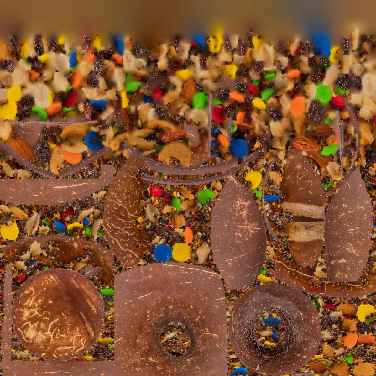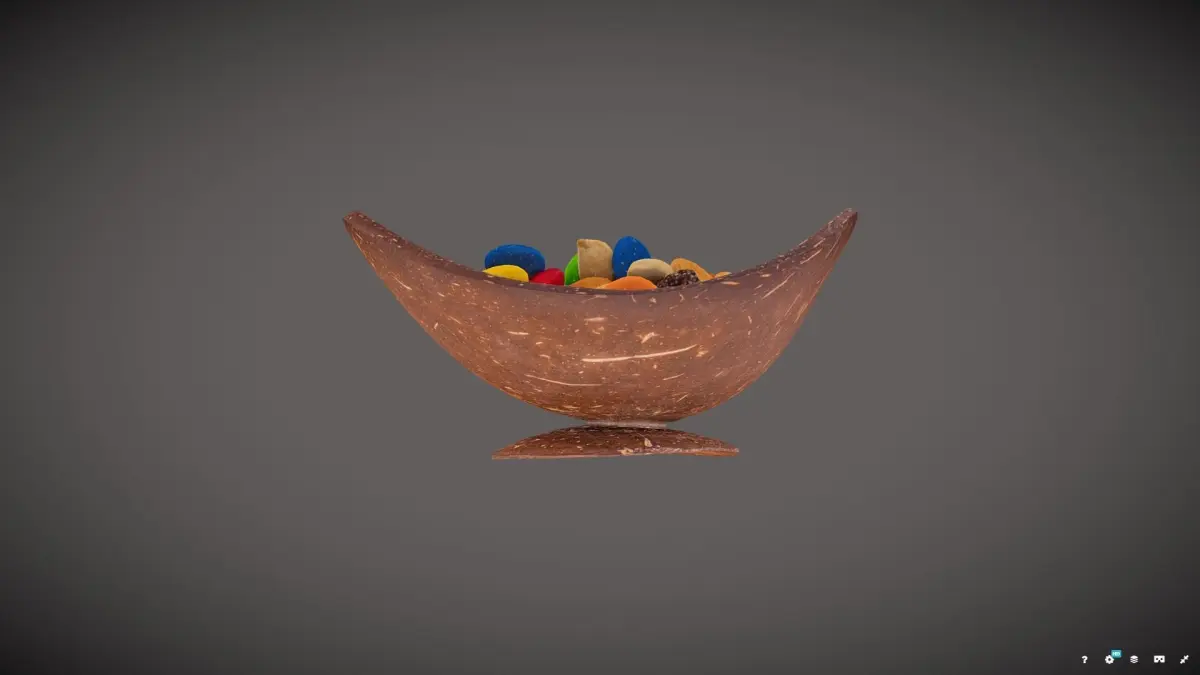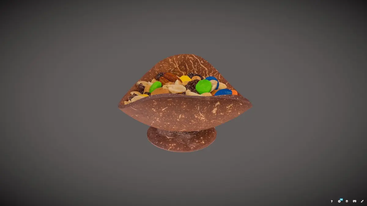 Photo-real, unlit, texturized model of a Cocconut Bowl with Swiss Mix Trail Mix. This object was generated using photogrammetry with a DSLR camera and images edited in Light Room, compiled in Reality Capture, and re-topologized in Insta-Mesh. The mesh is edited in Agisoft, and model retextured in Reality Capture.