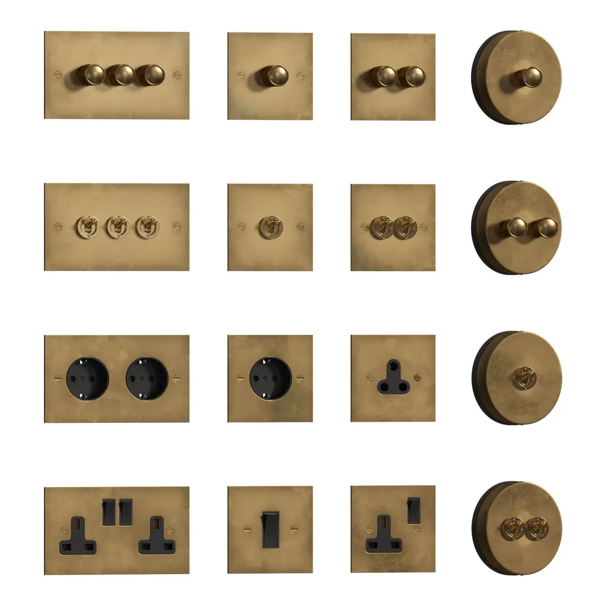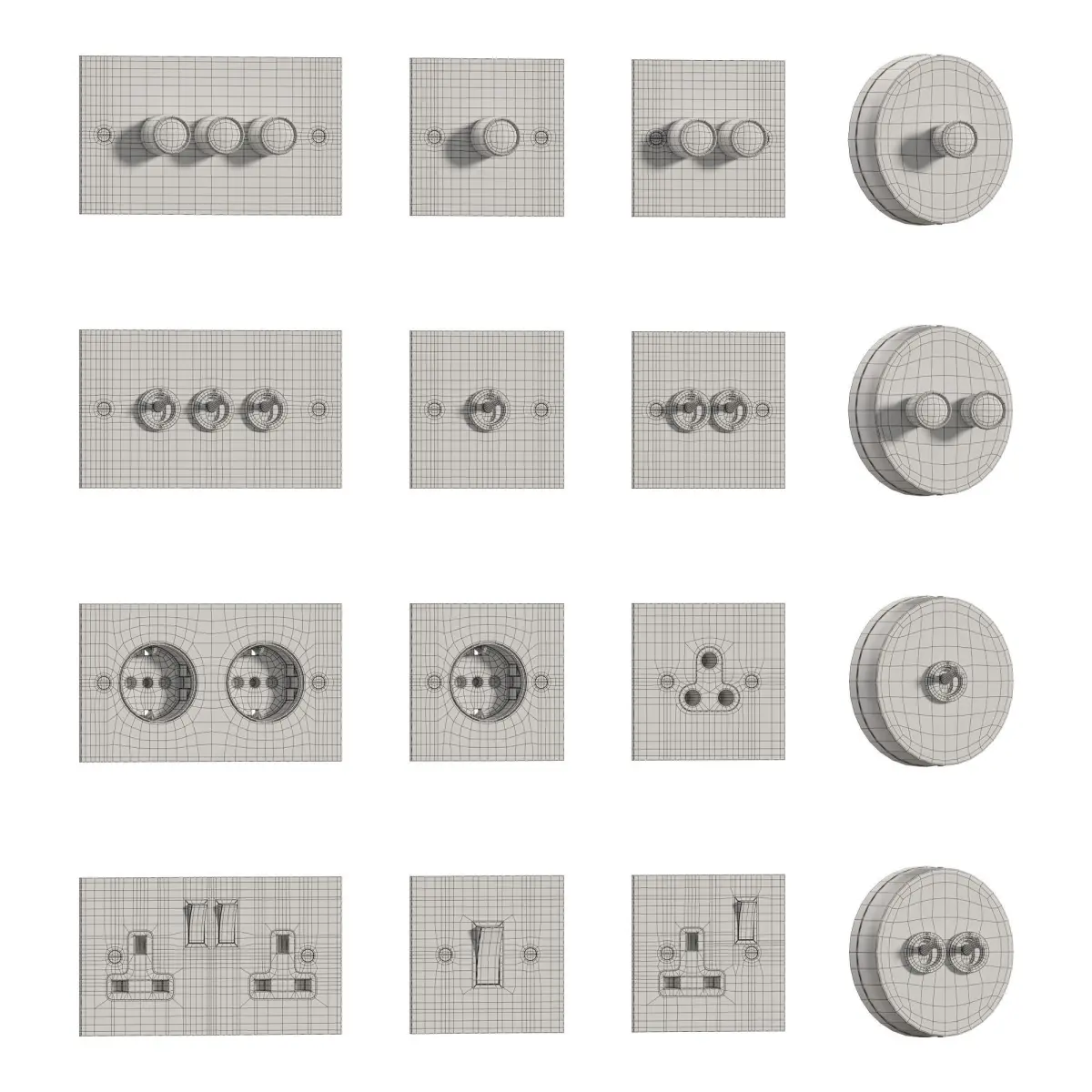 Switches & sockets are original designs that have been designed and made by handHigh detailed 3D modelAll geometry is ready for subdivisionUVW MappedPolys: 45423Verts: 48367Dimensions: 1 Gang: w 86 h 86 mm2 Gang: w 86 h 86 mm3 Gang: w 146 h 86 mm