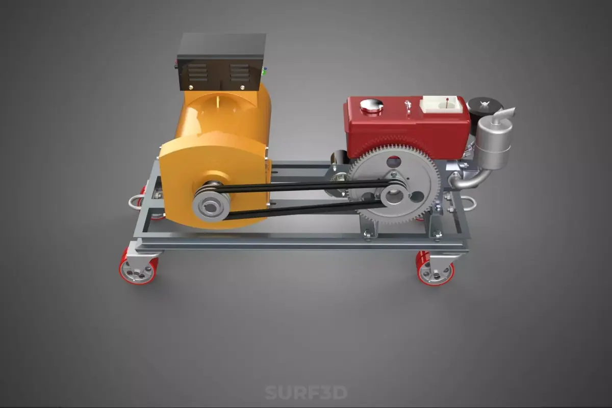 The assembly comprises three primary functional subsystems integrated onto a common, structurally rigid base frame (skid): the prime mover, the alternator, and the mobility platform.