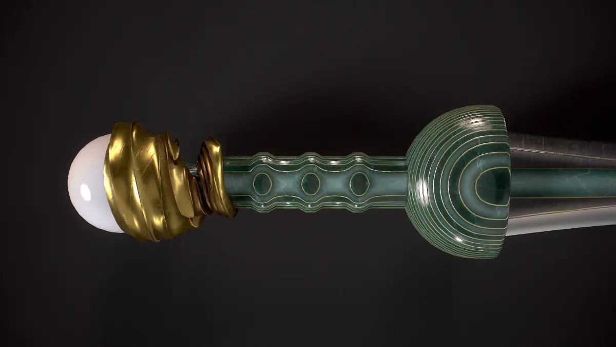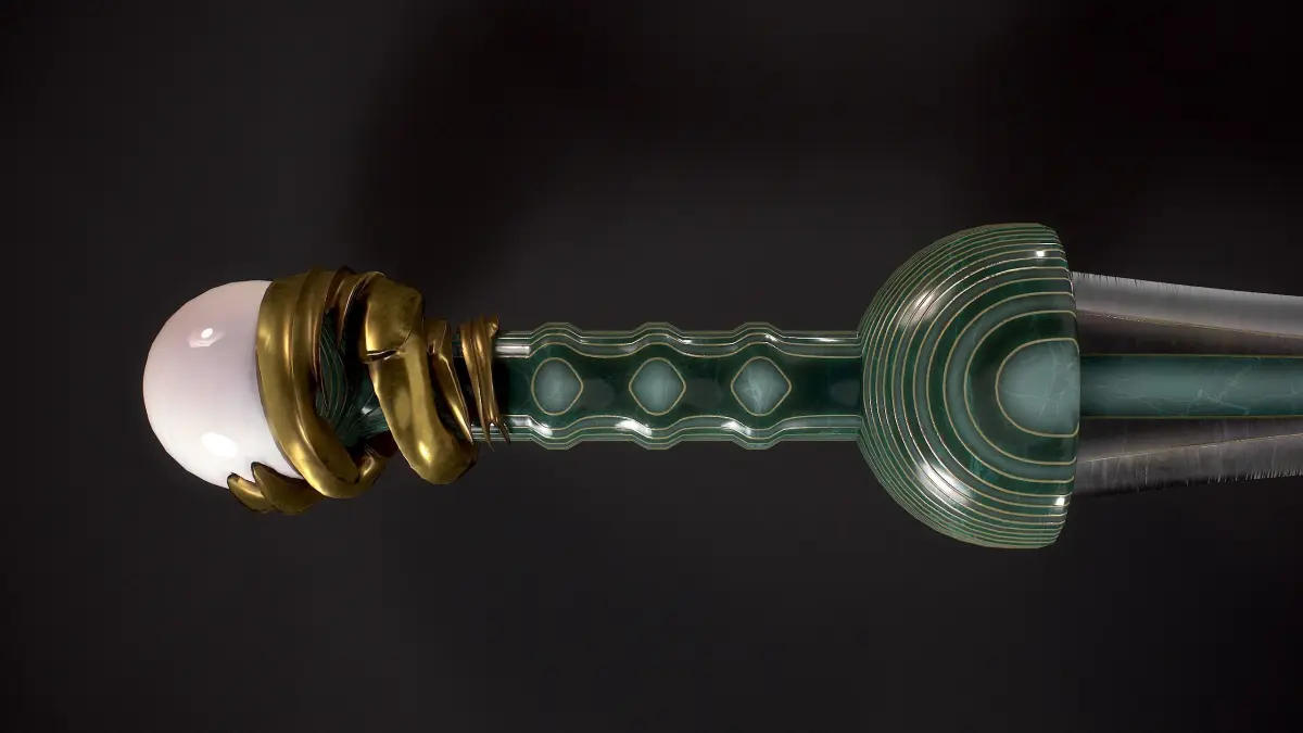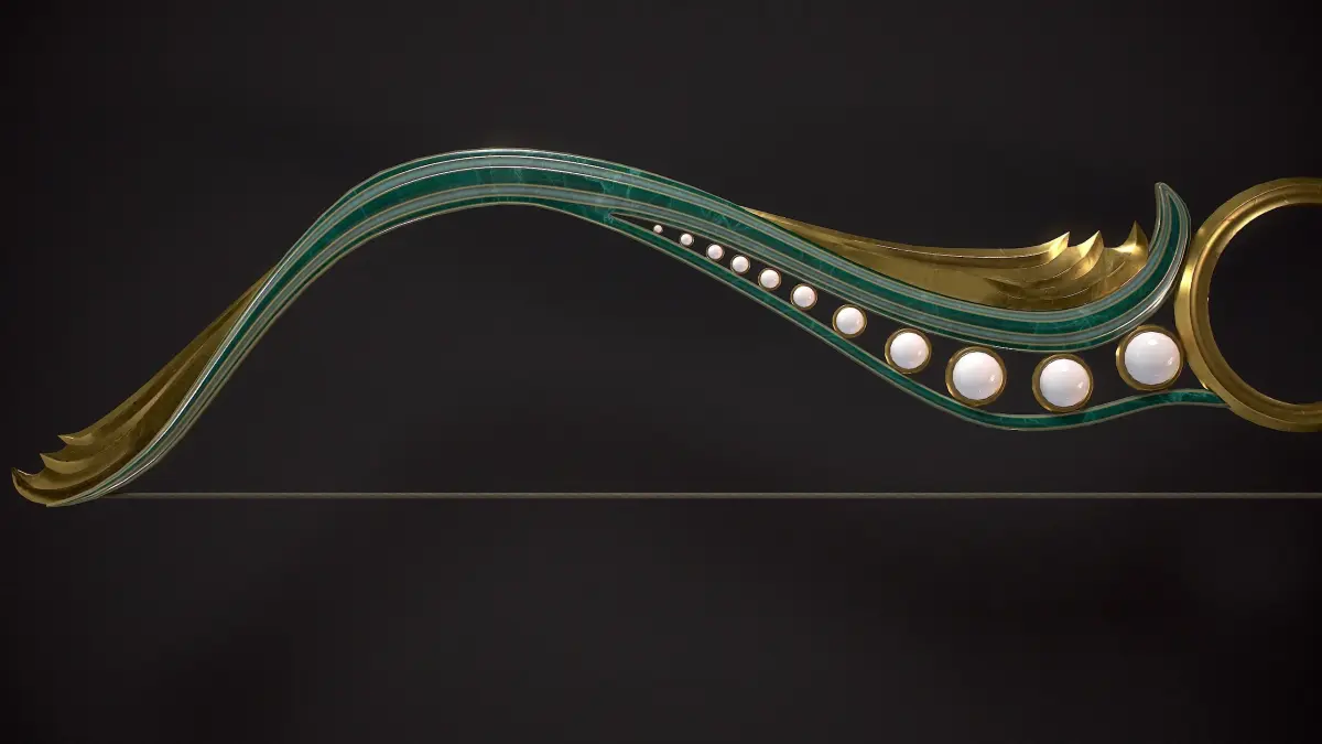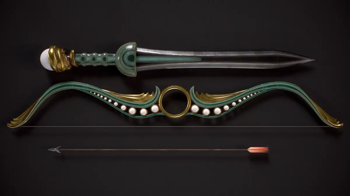 The Pearl-themed Mainz Gladius Sword and a Fantasy Bow in the Same Theme" is designed as a hero asset for in-game use. The grey areas seen in the UV map represent a mirrored UV map.