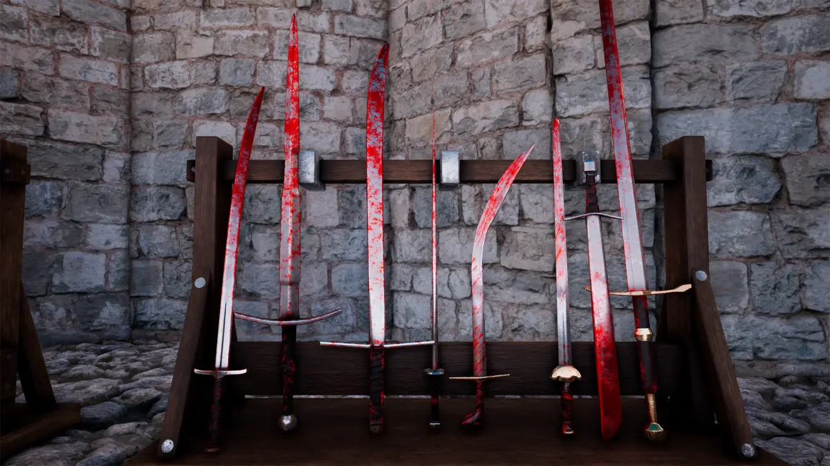 The materials have Dirt and Blood sliders so that the weapons can be changed procedurally during runtime.