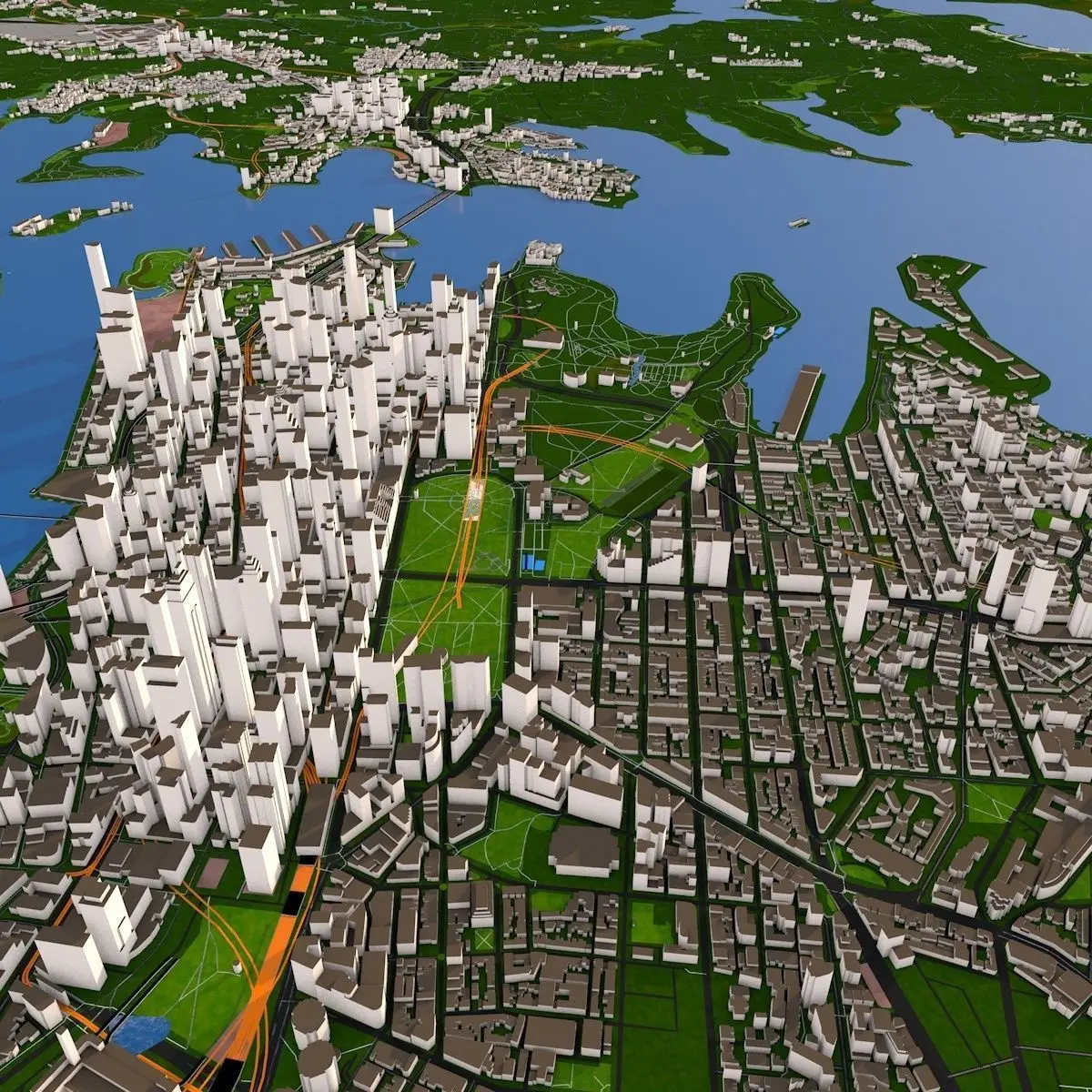 Building category : Low poly mesh with different groups (up to 50 category). Useful for motion graphics. You can show how many hospitals, clinics, office there and where exactly are those in the city.