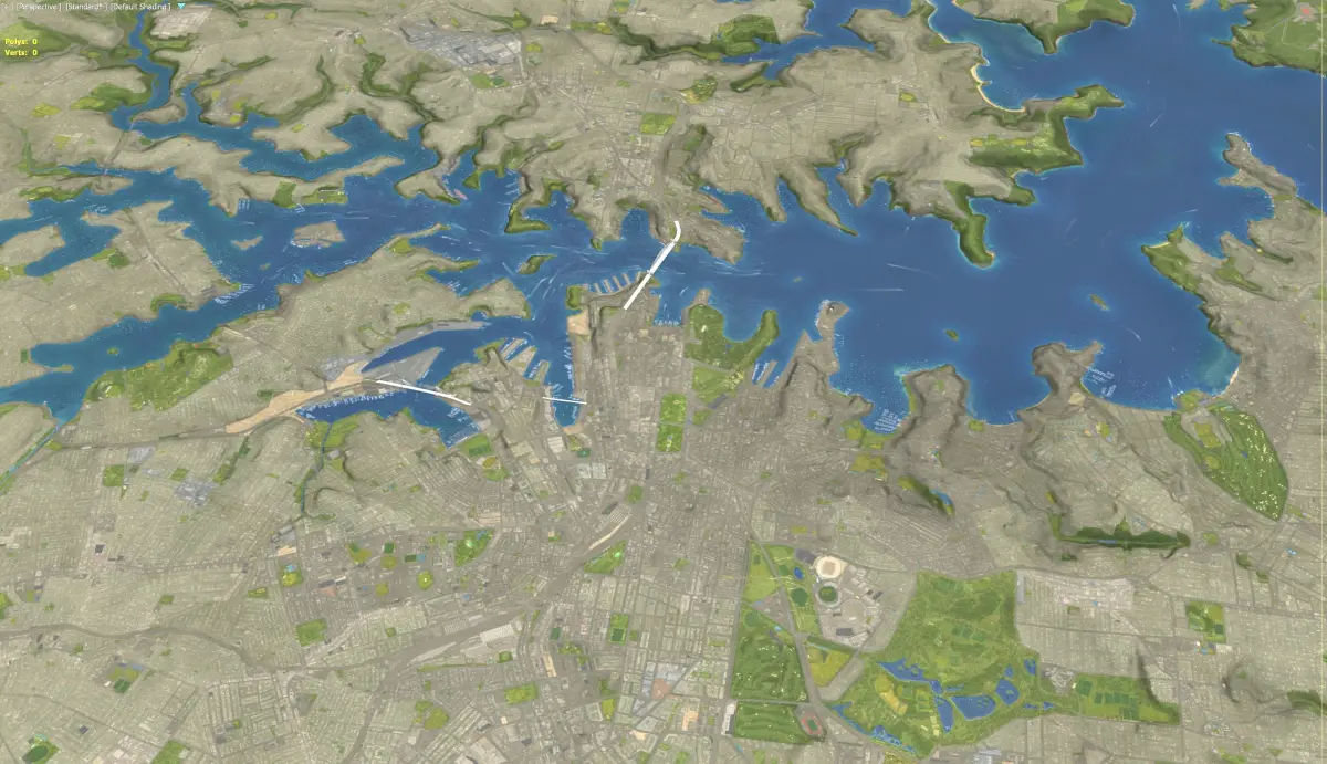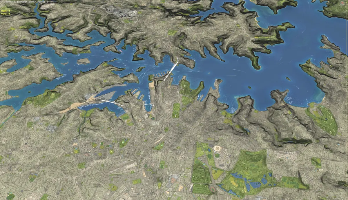 - Buildings, roads and trees placed on the optimized terrain