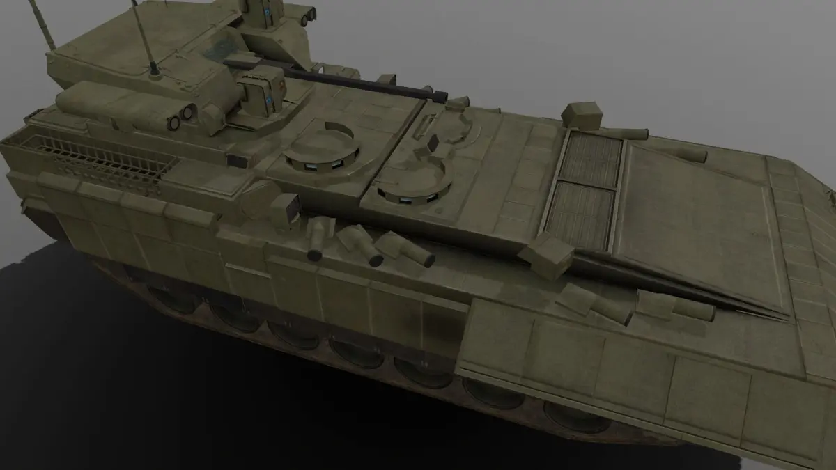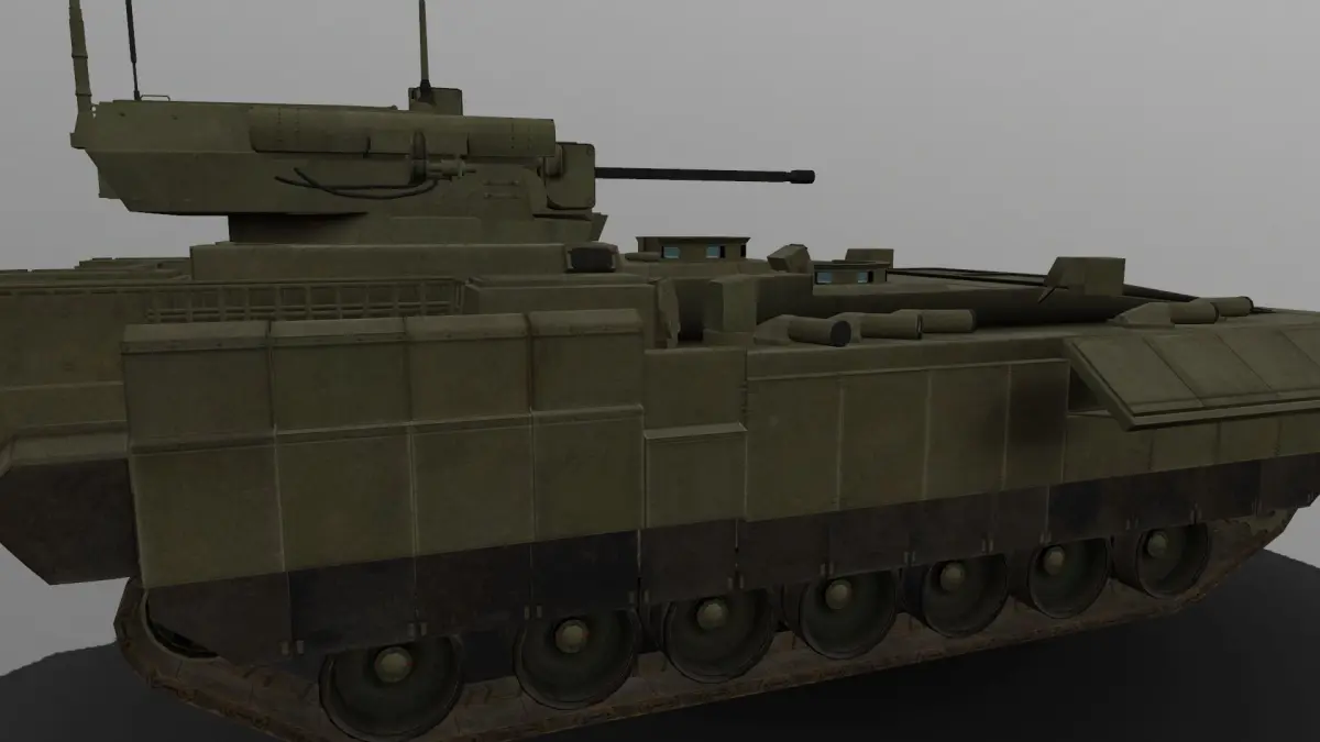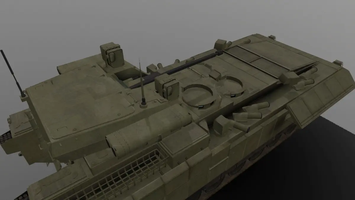 Like the T-14, the T-15 is protected by reactive armour[4] and the Afganit (Russian: Афганит) active protection system. While the T-14 has its Afganit launch tubes at the base of its turret, the T-15 has them arrayed along the top sides of its hull.[5] It uses four soft-kill launchers to deploy smoke grenades that disrupt visual and infrared guidance systems, and five hard-kill launch tubes on top of the hull, compared to the T-14's ten hard-kill tubes on the turret which automatically turns to face a threat.[2] The T-15 has an unprecedented level of armor protection, including improved passive steel and ceramic composite plate armor and a slat armor cage at the rear. Its new Malakhit (Malachite) ERA is claimed to protect against ATGMs like the FGM-148 Javelin and Missile Moyenne Portée (MMP) and 120 mm tank rounds like the German DM53/DM63 and American M829A3 APFSDS sabots. In addition to hard-kill and soft-kill APS, the developer uses a special paint that significantly reduces the vehicle's infrared signature. The floor is reinforced with an additional armor plate for counter-mine and counter-IED protection, and it has a jamming system to detonate radio-controlled anti-tank mines. The T-15 has an NBC protection system.[1]