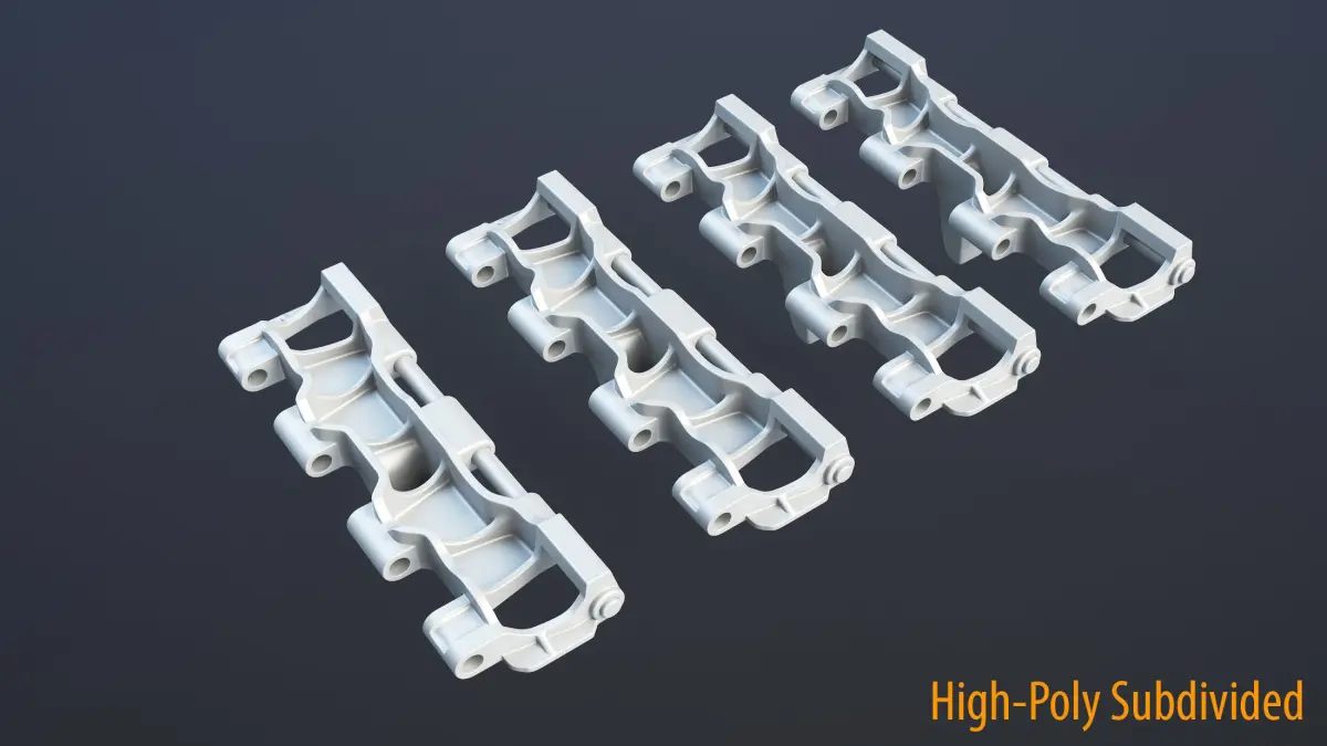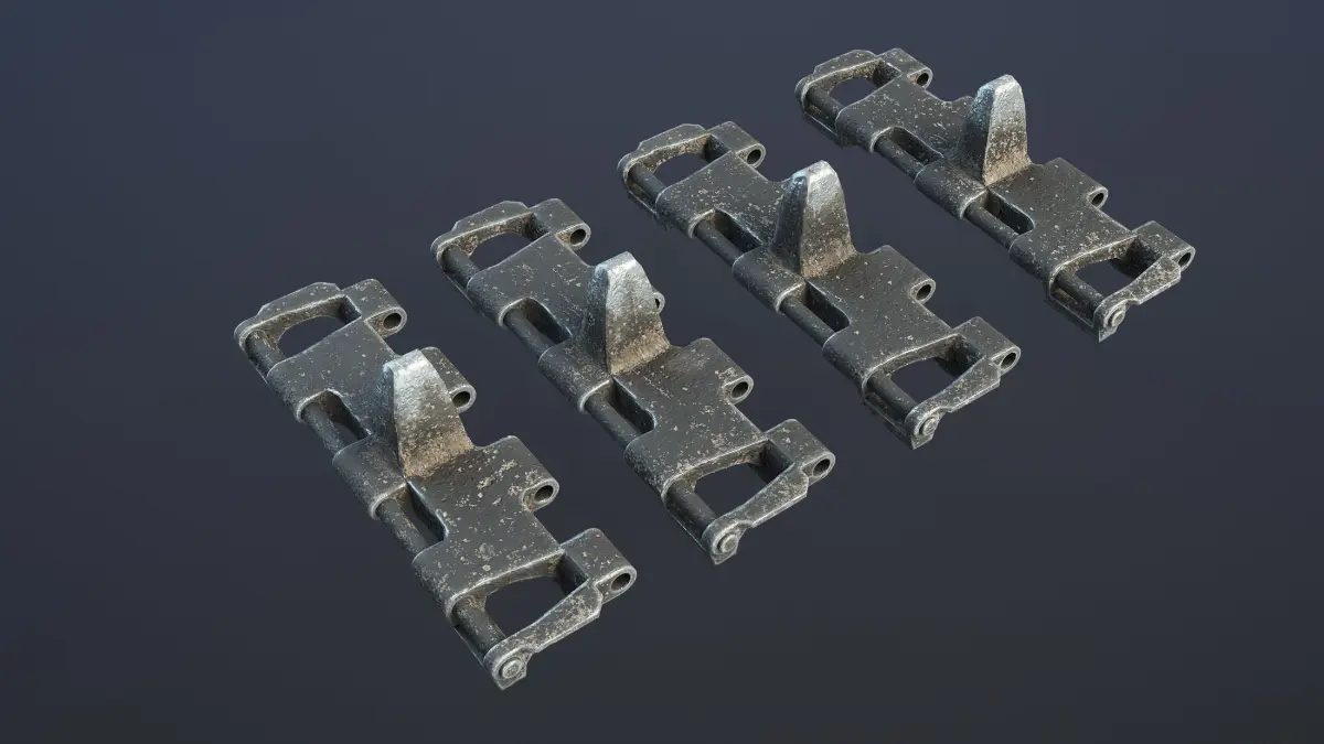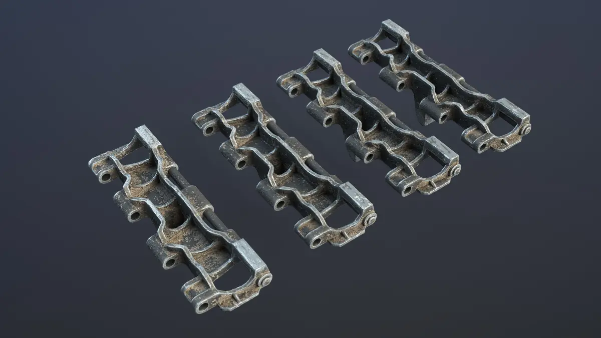 3d-model of tracks for Soviet tanks T-55/T-62. Set included textured mid-poly model and high-poly for subdivide with no textures and UVs.