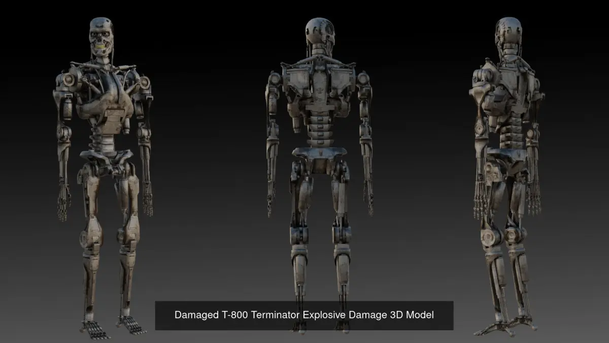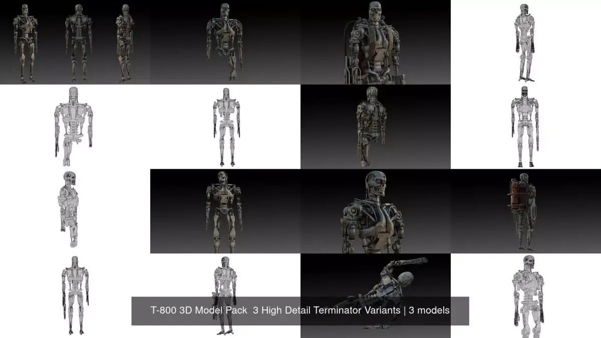 A powerful collection of three detailed T-800 Terminator models, perfect for sci-fi and cyberpunk-themed projects. This pack includes three variations of the iconic endoskeleton with unique designs and poses, ideal for use in games, cinematic productions, concept art, or collectibles.