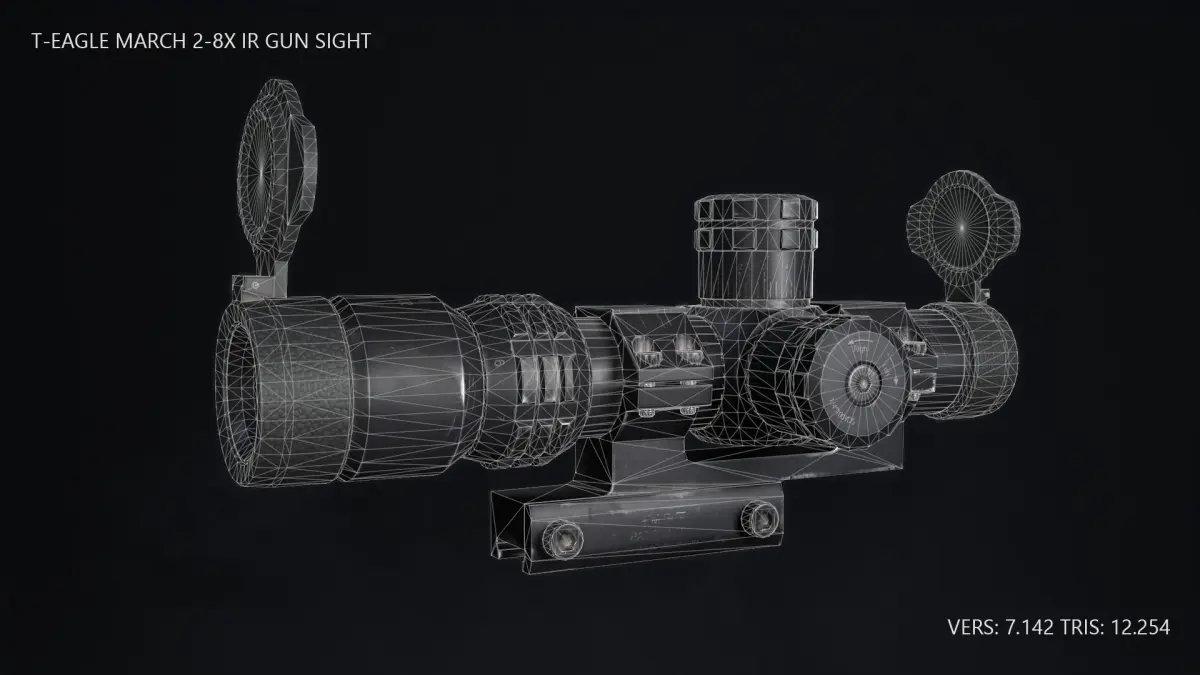 T-EANGLE MARCH 2-8x GUN SIGHT 3D model is a study of the steps and processes of a game asset development pipeline, from blocking, highpoly, lowpoly, opening the uv map, baking the model and texturing. With 7.142 vertices and 12.254 polygons. With Substance painter Files.