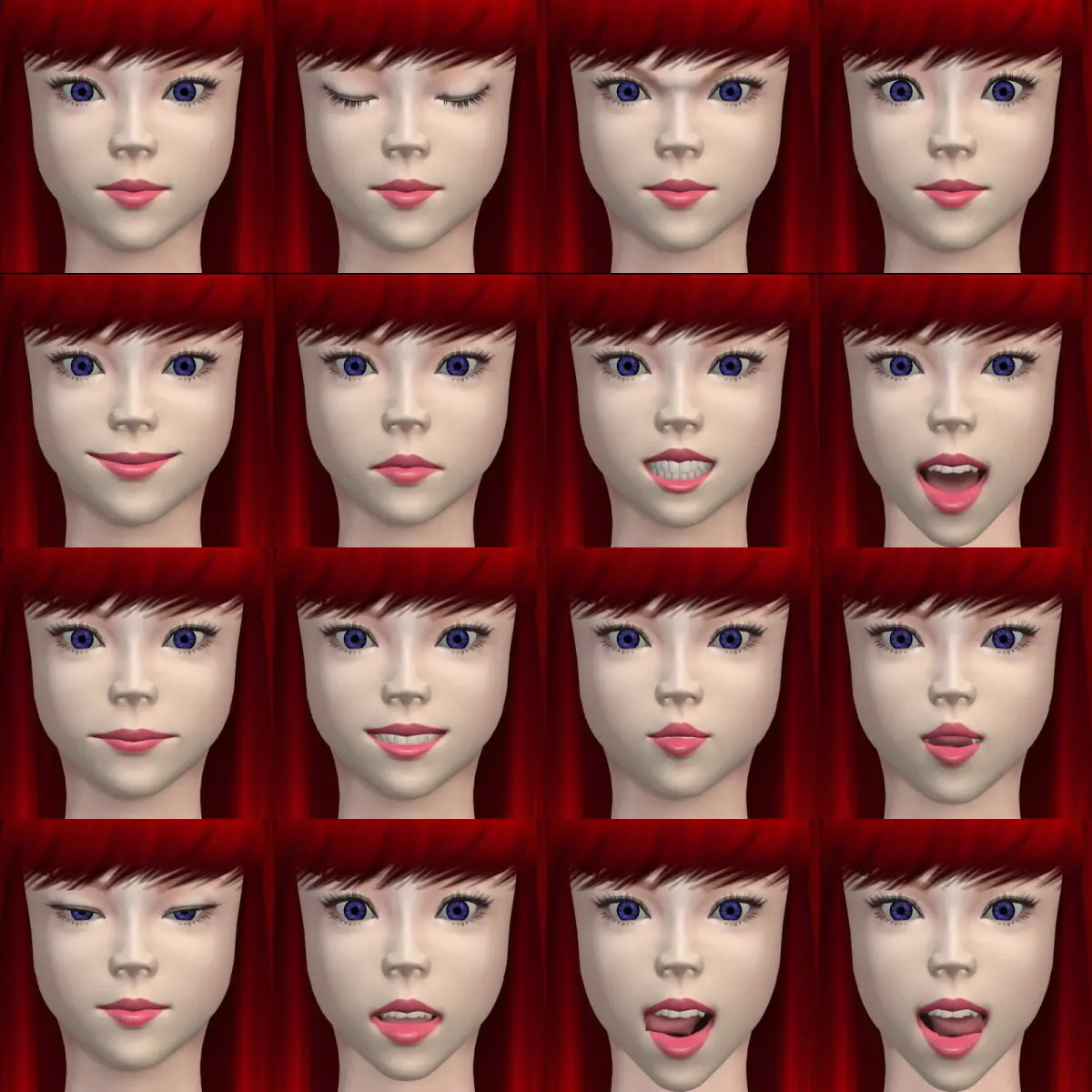 - Mouth: Normal, smile, sulk, grin, open, straight, duck.