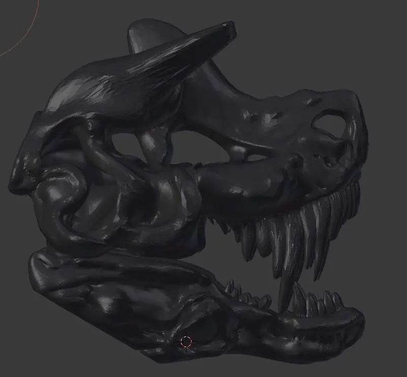 I sculpted a new skull ontop the old one, Massive Fangs, cutaways for the bottom jaw fang clearance, added some horns on the chin, some up top. also found some cavities, so I removed those teeth.