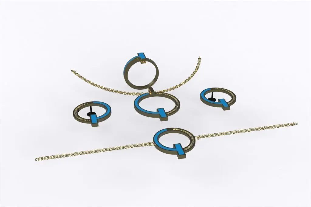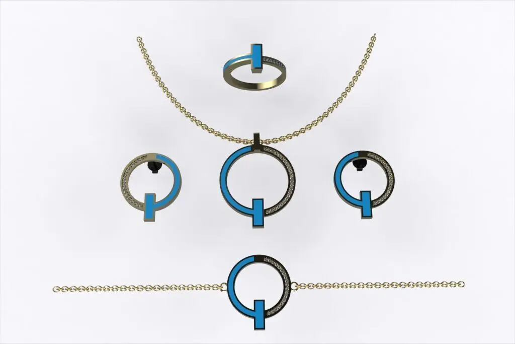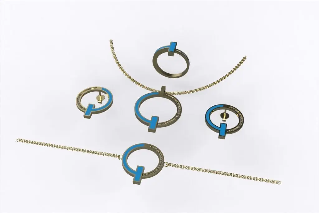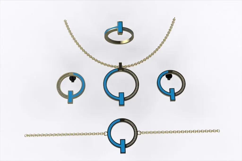 Inspired by the iconic Tiffany design philosophy, this 3D jewelry set captures the essence of minimalist elegance. Each piece—necklace, bracelet, earrings, and ring—features a bold open-circle geometry intersected by a clean vertical bar, half-set with pavé diamonds. Crafted in polished 18K yellow gold, this architectural yet timeless ensemble brings refined balance and modern sophistication. A high-end asset ideal for 3D printing, rendering, or custom fine jewelry production.