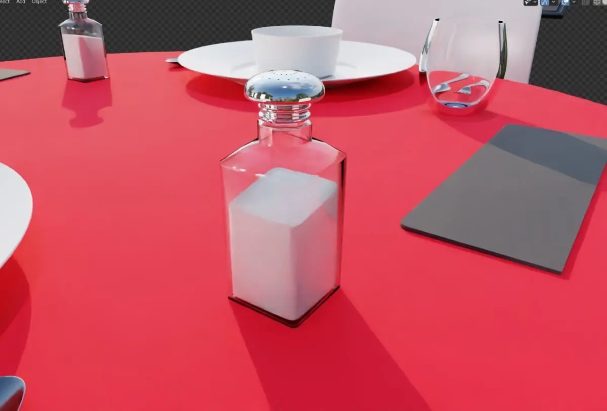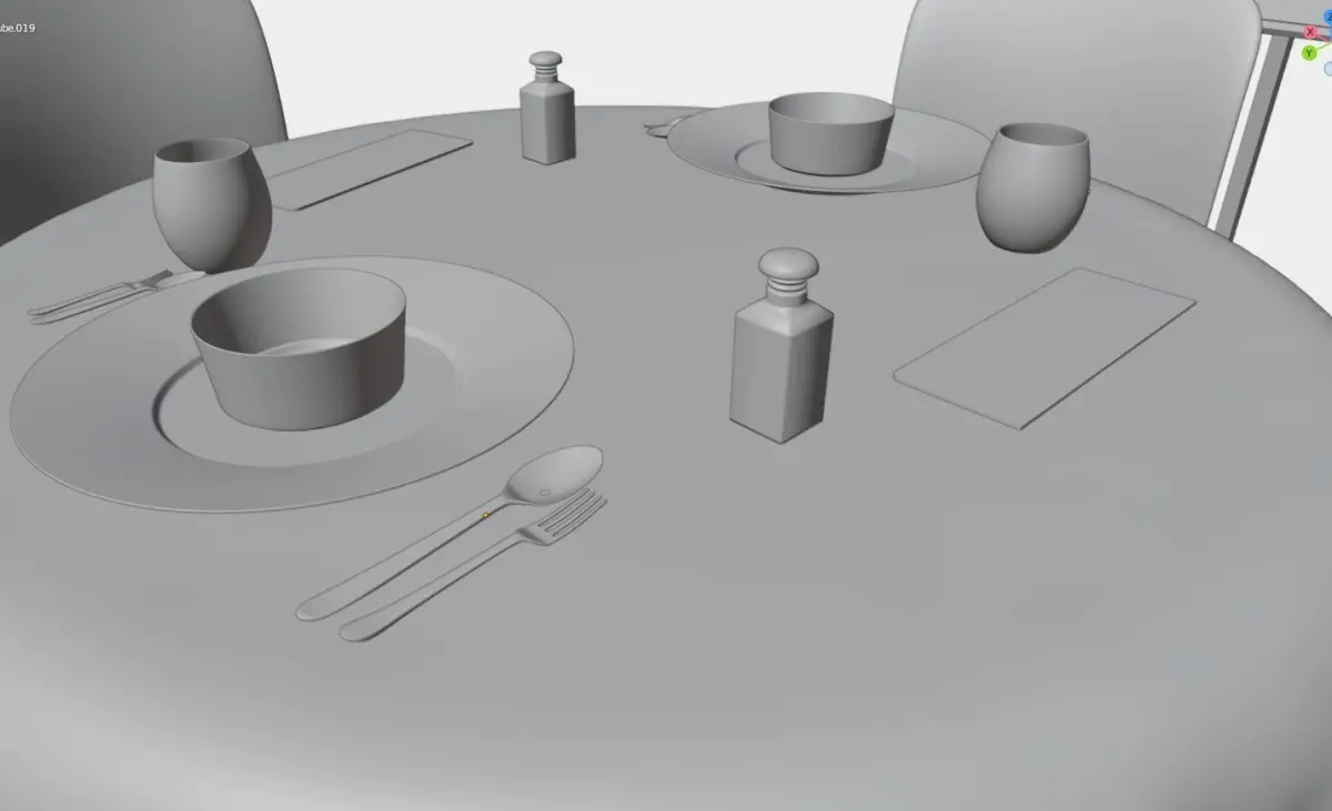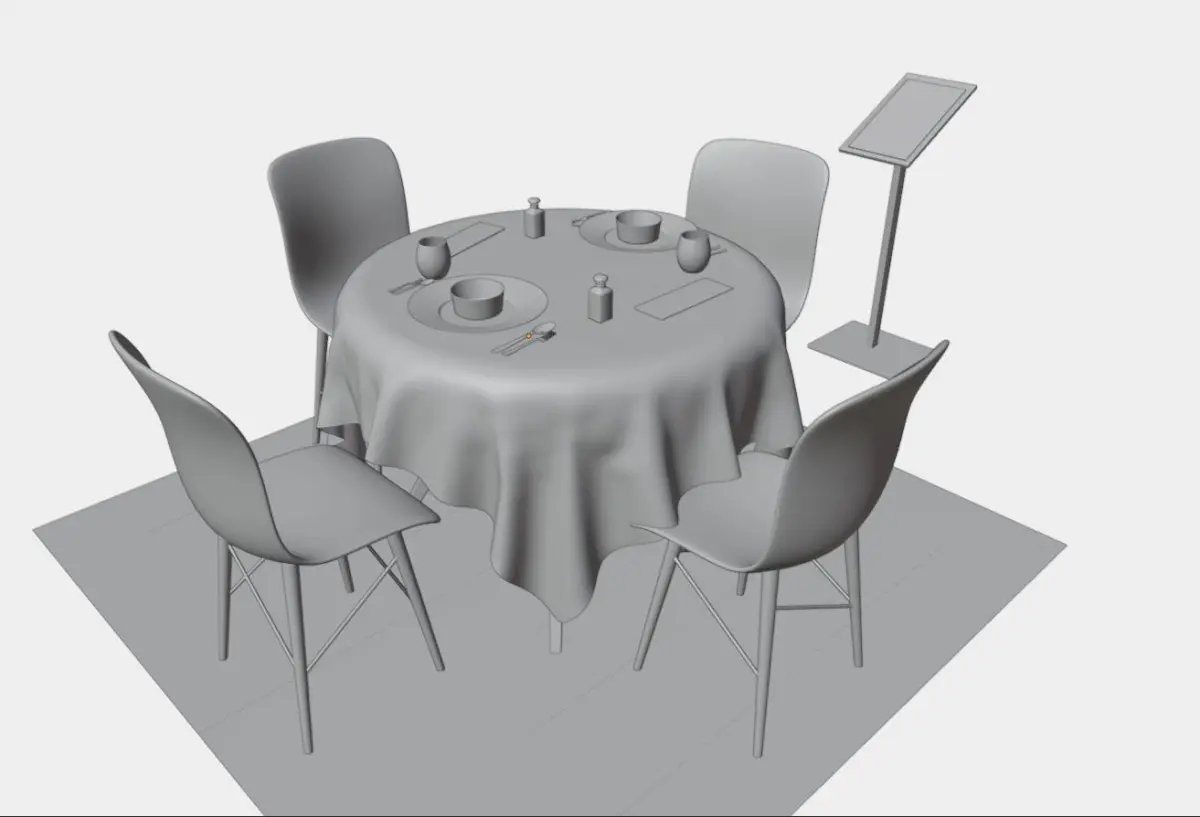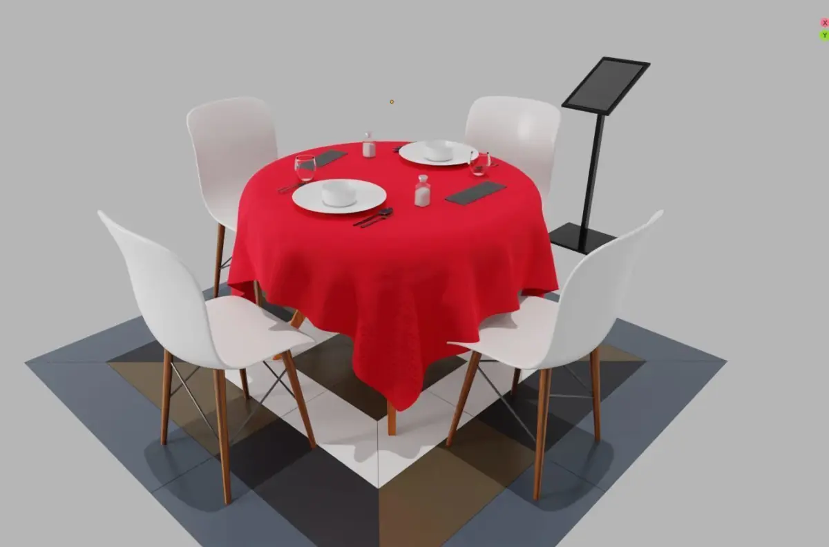 This model includes a fork, salt, spoon, table and fabric, chair, brochure, floor marble, bill of fare, plate bowls and glass.