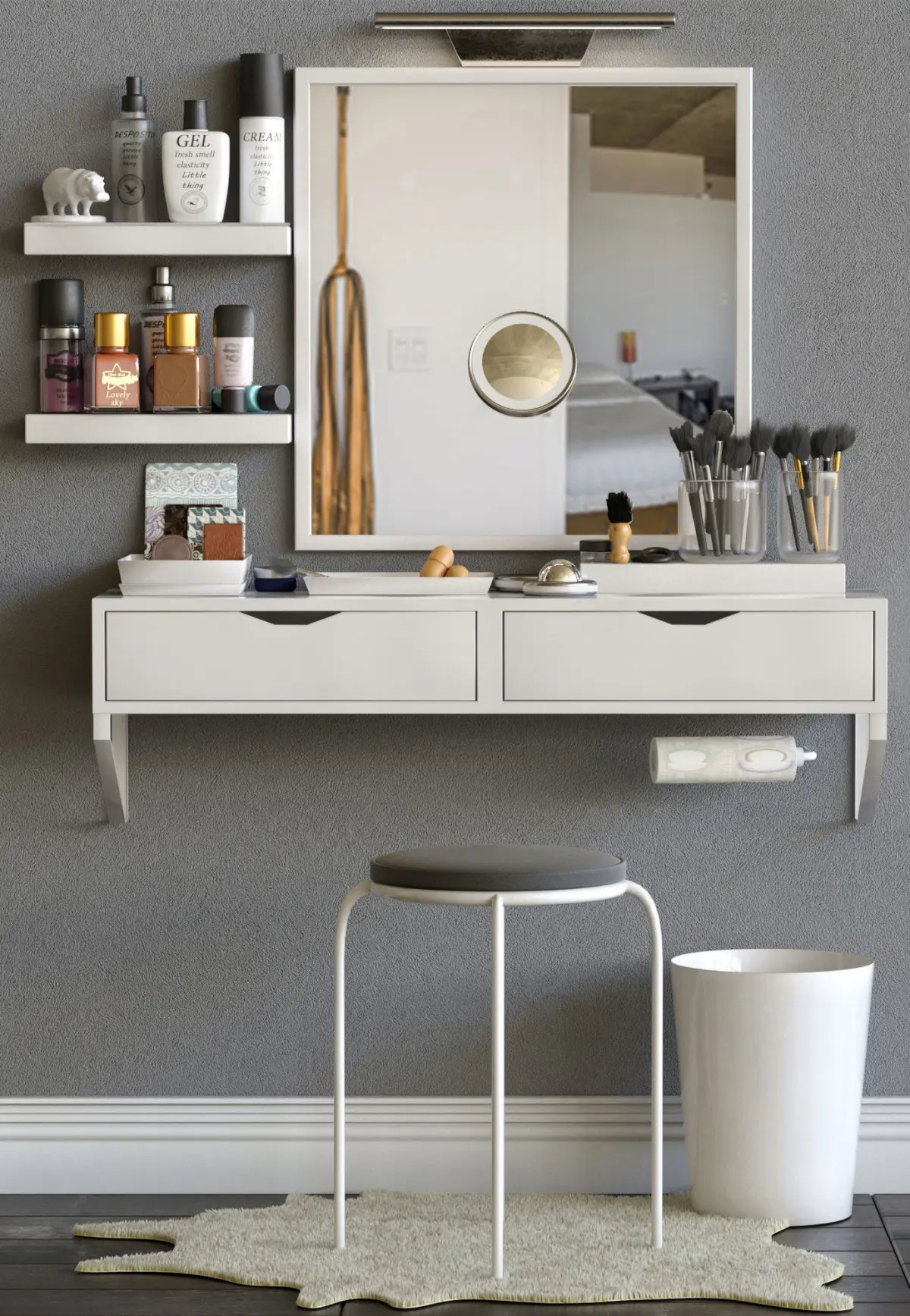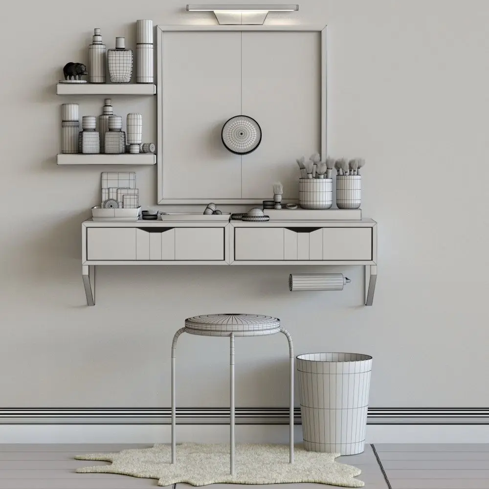 This decorative set is perfect for both a bedroom and a beauty salon.In the archive there is an excellent rendering and completion of the project for all 100