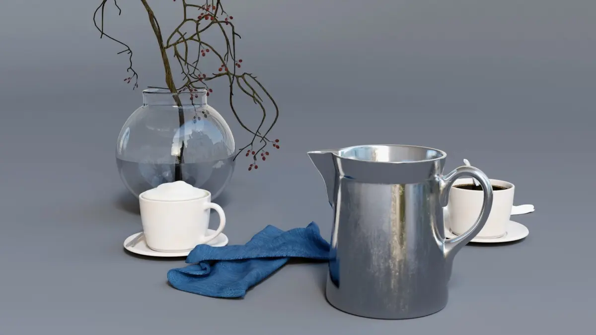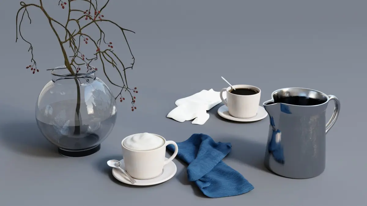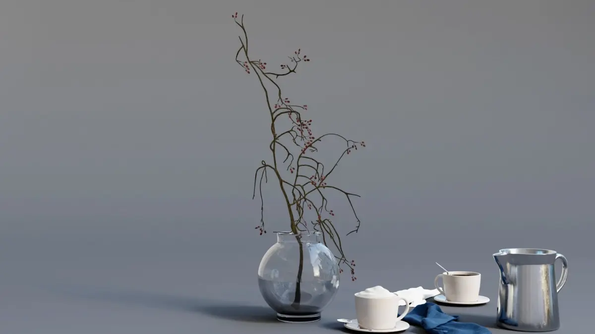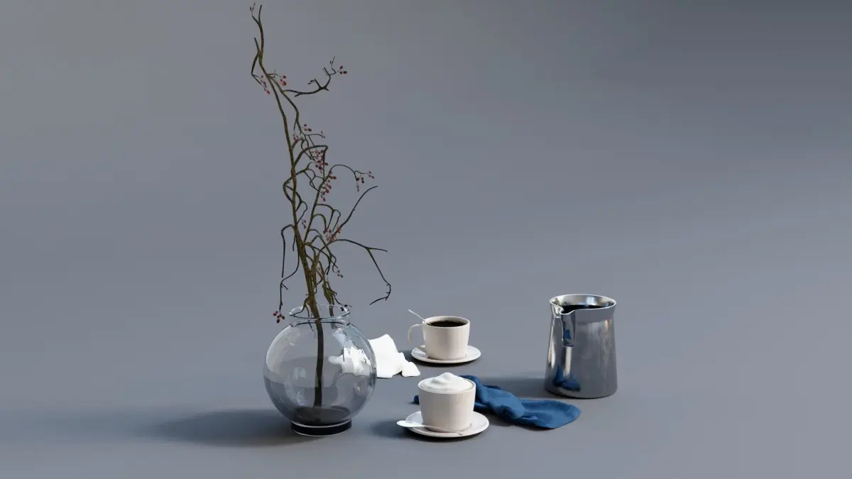 THIS MODEL CONTAINS:1 Metalic Coffe pot2 Porcelain Coffee Cups with saucer and spoon2 Fabric Napkins1 Round glass vase with water1 branch plant with small dark red leaves