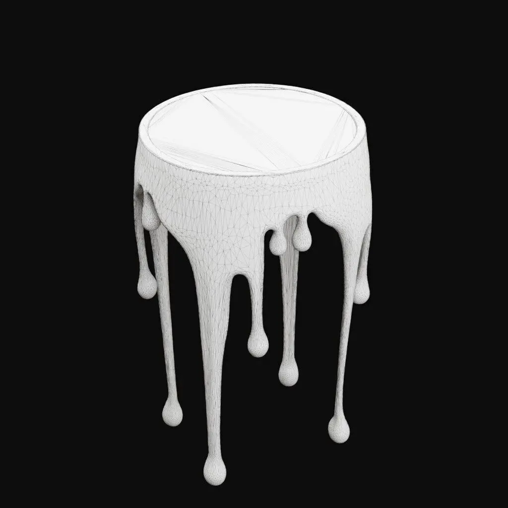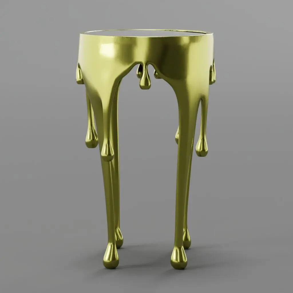 This golden metallic table features a unique design where the legs appear to be formed by molten drips, creating a luxurious and artistic statement piece.