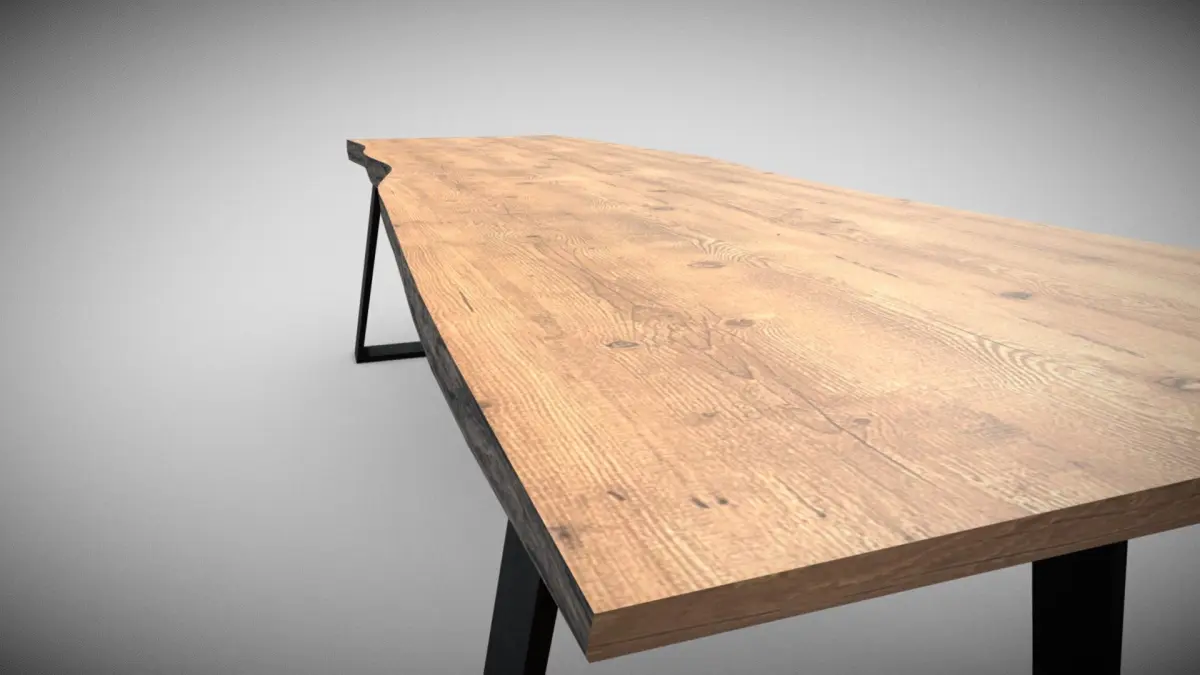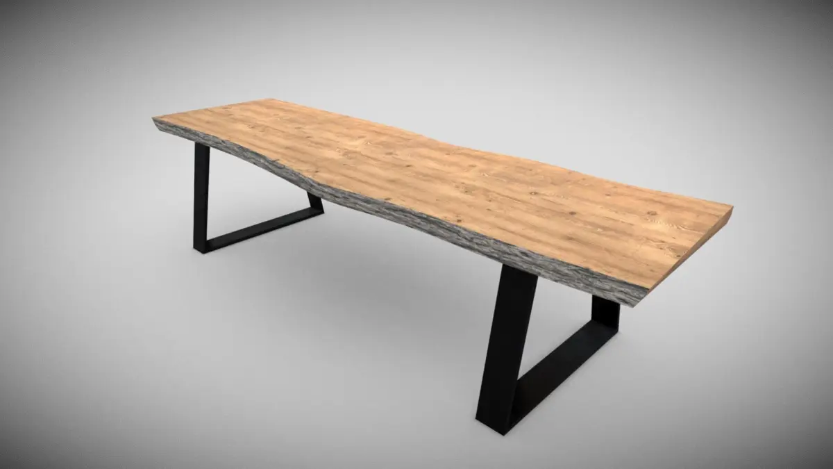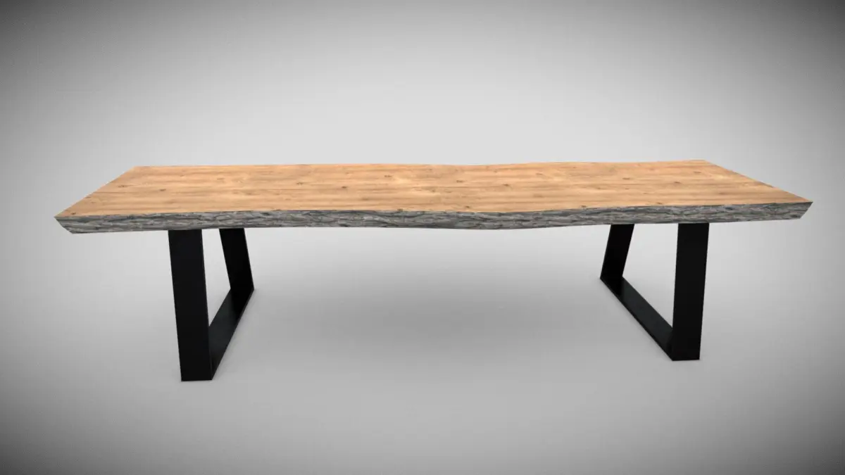 This is a modern, rustic-style table featuring a live-edge wooden top with a natural finish. The surface showcases the wood's natural grain and texture, adding a warm and organic feel. The table is supported by sturdy black metal legs in a sleek, angular design, creating a stylish contrast between industrial and natural elements. Ideal for dining or workspace settings, this table combines functionality with aesthetic appeal.