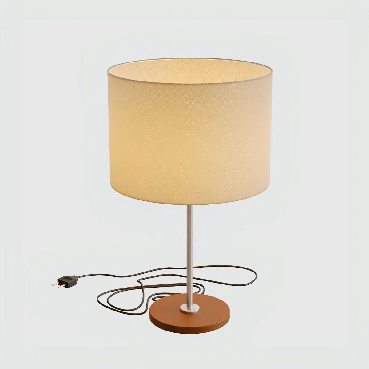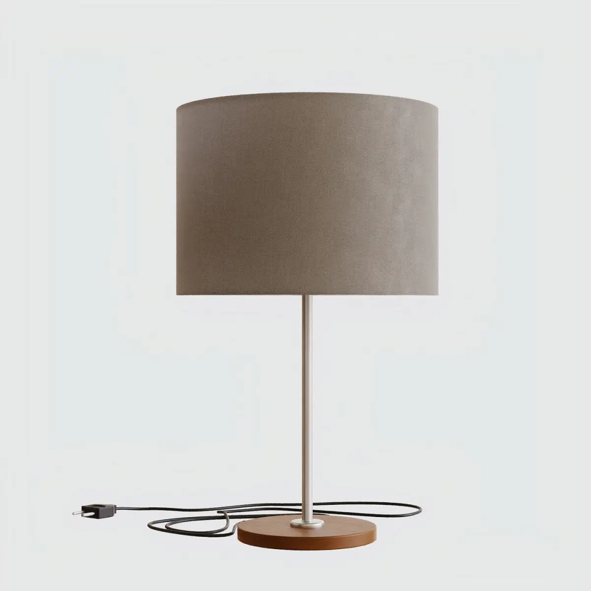 Table lamp with wooden base, metal structural body and gray fabric shade. Measurements: W300mm x H490mm x D300mm. Textures in PBR and ready for use in Corona Render (Version 12 used)