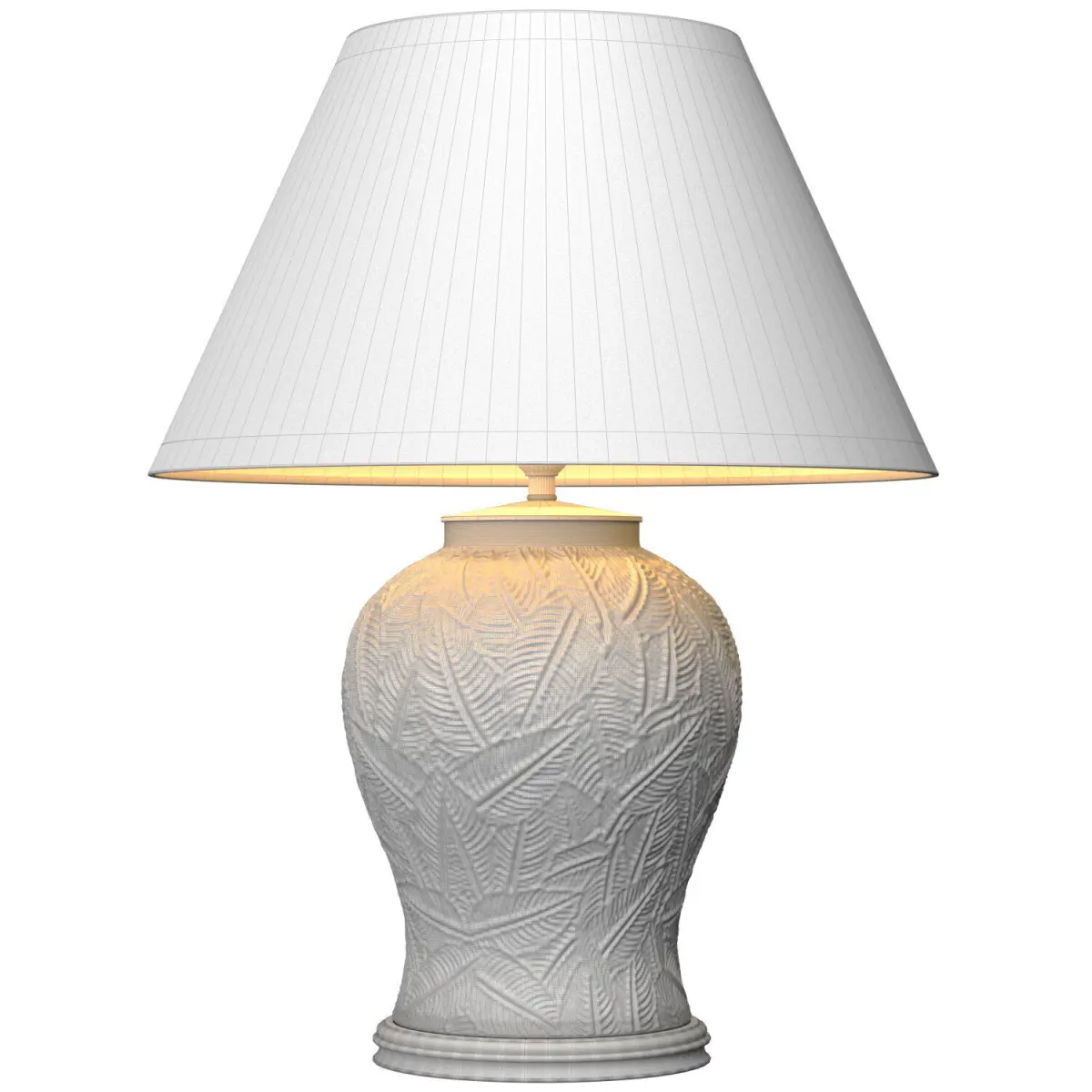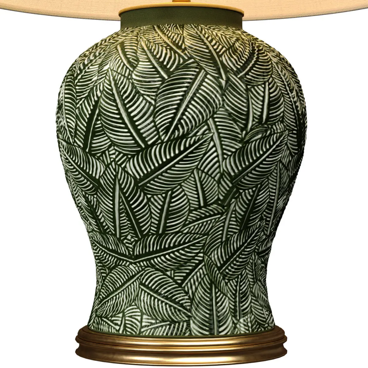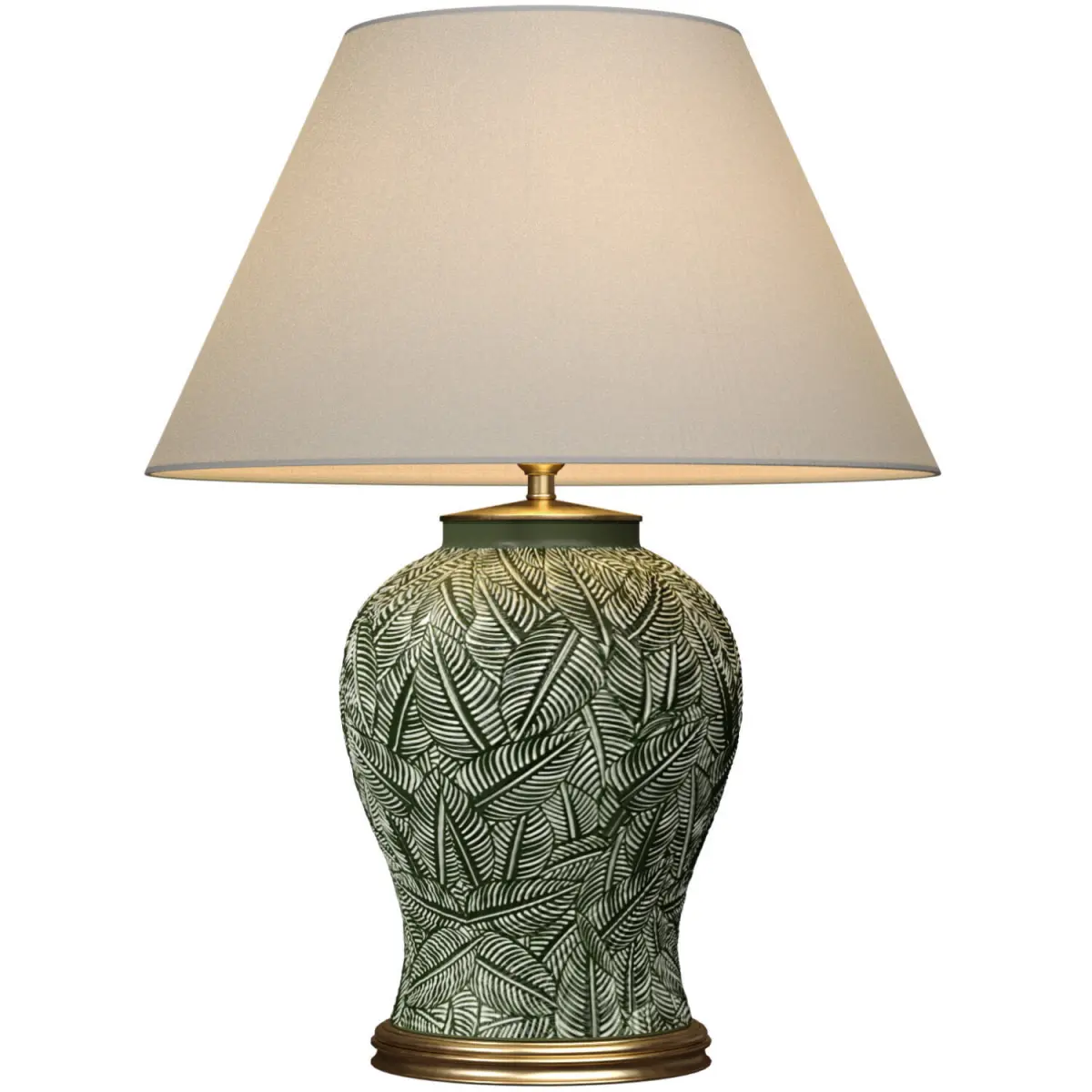 This arborous beauty will give your home décor a tropical touch. The green ceramic lamp base features a wonderful leaf relief and a ribbed rim with antique brass finish. It comes with an off-white lampshade.