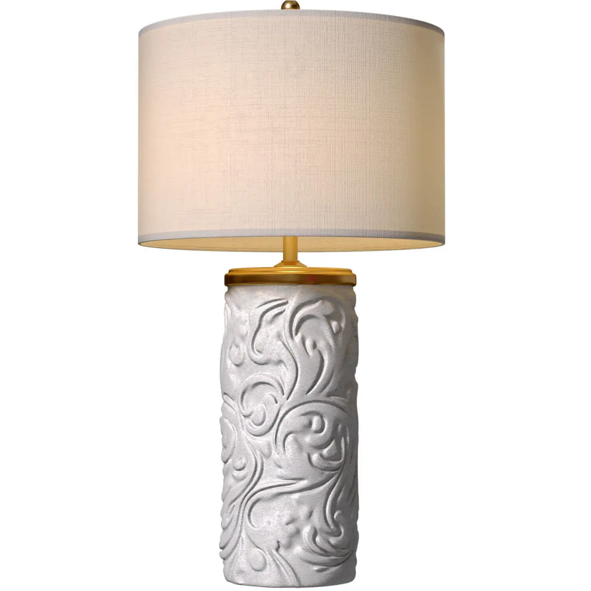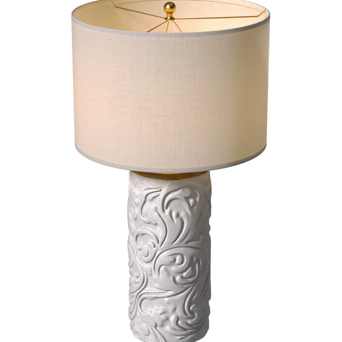 This stunning table lamp is sure to add a distinctive style to your home. Inspired by the lily leaf, the Alba Flora collection will bring a royal and elegant touch to any living space. The design features a sculptural print of white leaves intertwined with each other. The drum shade is trimmed in ivory fabric with a reflective metallic gold interior. Display it with other matching home decor items for a cohesive look.