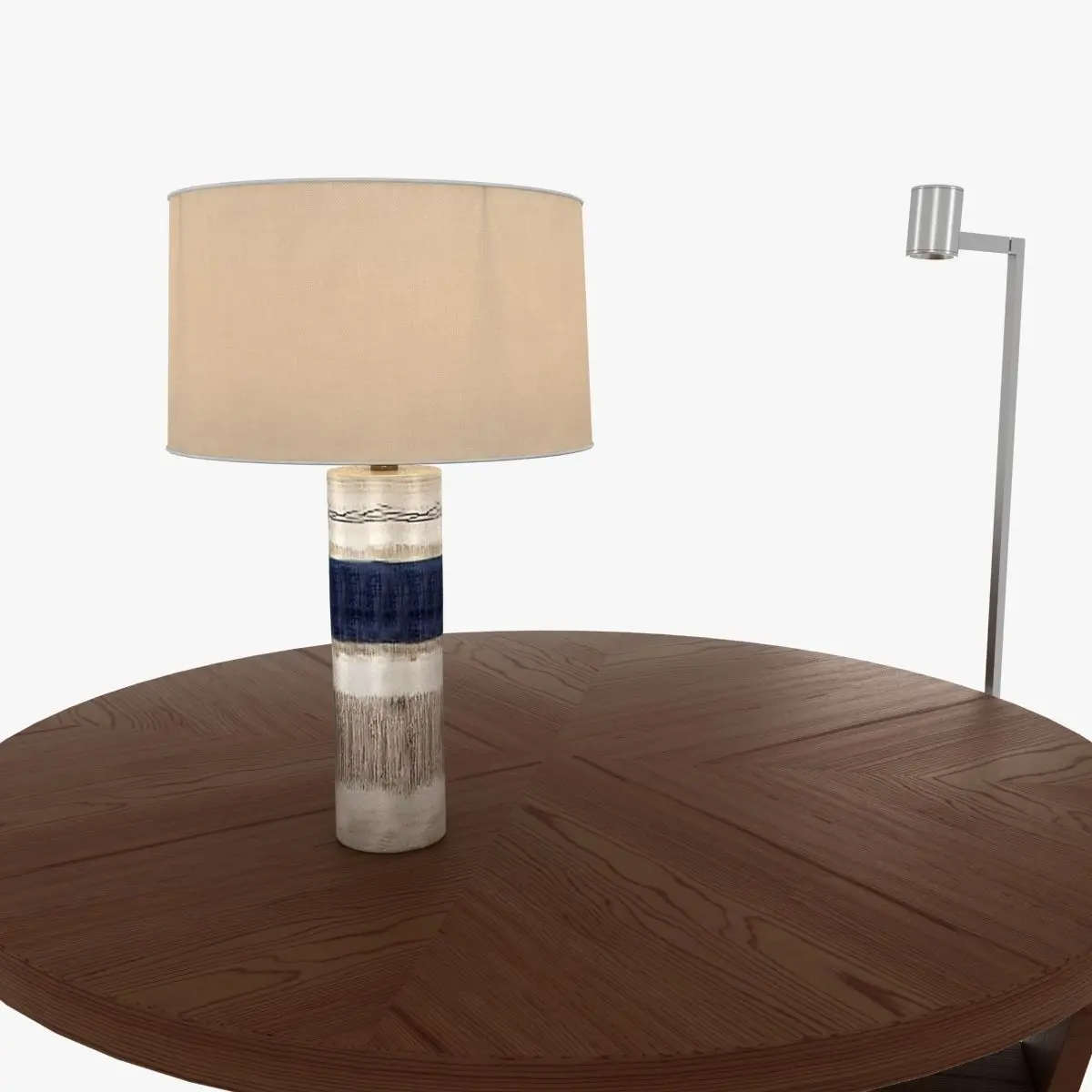 table lamp - arteriors Mariella LampH: 64.77cm Dia: 43.18cmThe Mariella Lamp showcases the best of Portuguese artistry to provide form and function. This porcelain piece features crosshatch detailing with brown and blue accents that accent each hand detail. Topped with a round drum ivory microfiber shade lined to match.