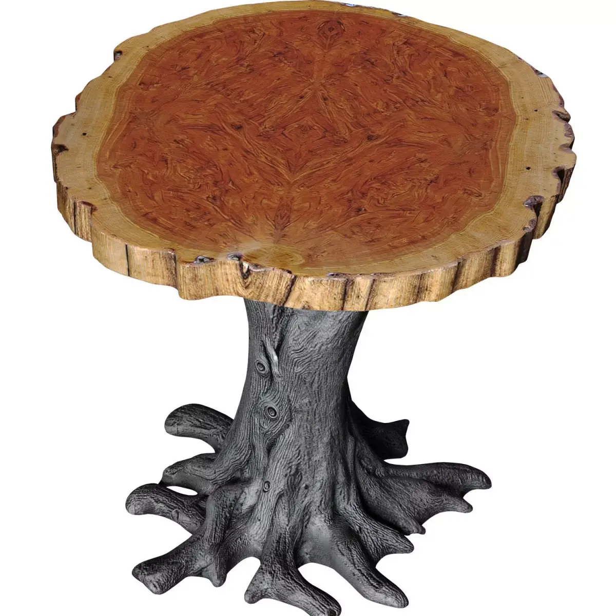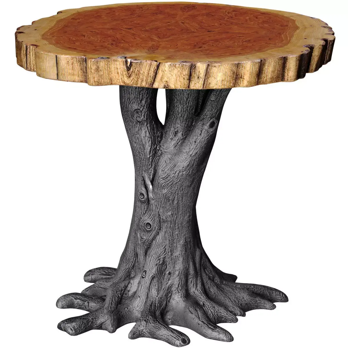 Sundermill Rootstone TableRound Stump TableStump Half Log Coffee TableMassive natural live-edge slab top with full visible rings and organic perimeter.Root-formed pedestal base sculpted to replicate real aged wood with deep texture.Hand-applied finish that preserves natural grain while sealing the slab for longevity.