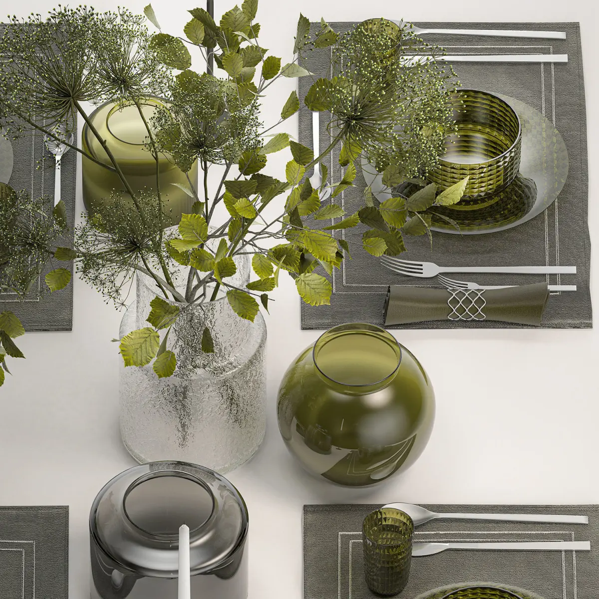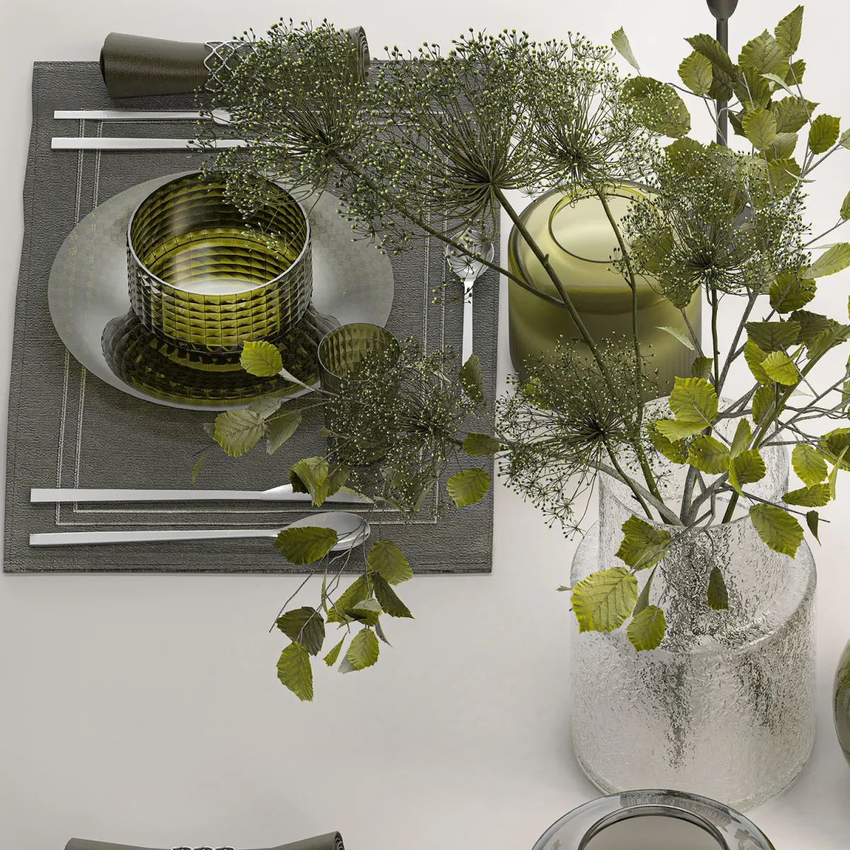 ikea, zara home, tablecloth, glass, vase, 4 persons, luxury decor, table decoration, cutlery, fork, knife, glass, green glass, candles, stylish, festive, solemn, wedding decor, decoration, installation, eco style, scandinian style, natural materials, wedding decoration, branches, KONSTFULL, hogweed, hazel, hazel, bouquet, linden, Heracleum, hogweed