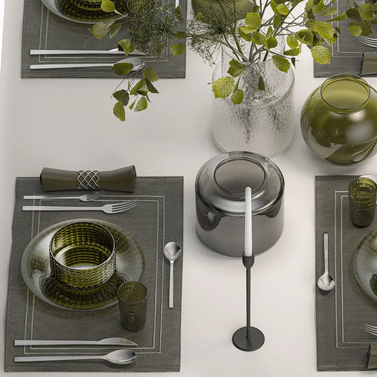 Stylish table setting for 4 persons with a bouquet of branches.Solemn table setting in eco style from branches and natural decor.ZARA HOME, ikeabranches,Green glass vaseGlass vase ikea, IKEA, KONSTFULLHeracleum - hogweedCow Parsnip, hogweedCorylus, filbert, Hazel - hazel, hazelTilia - Linden