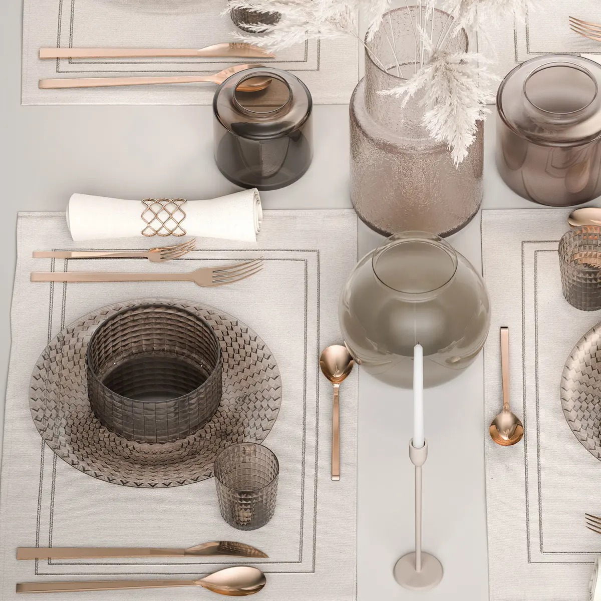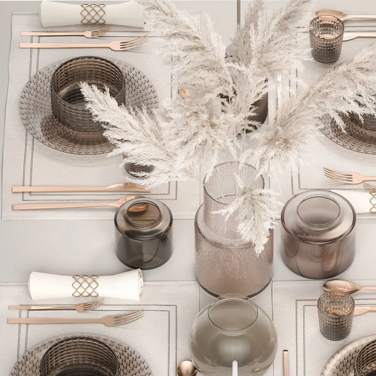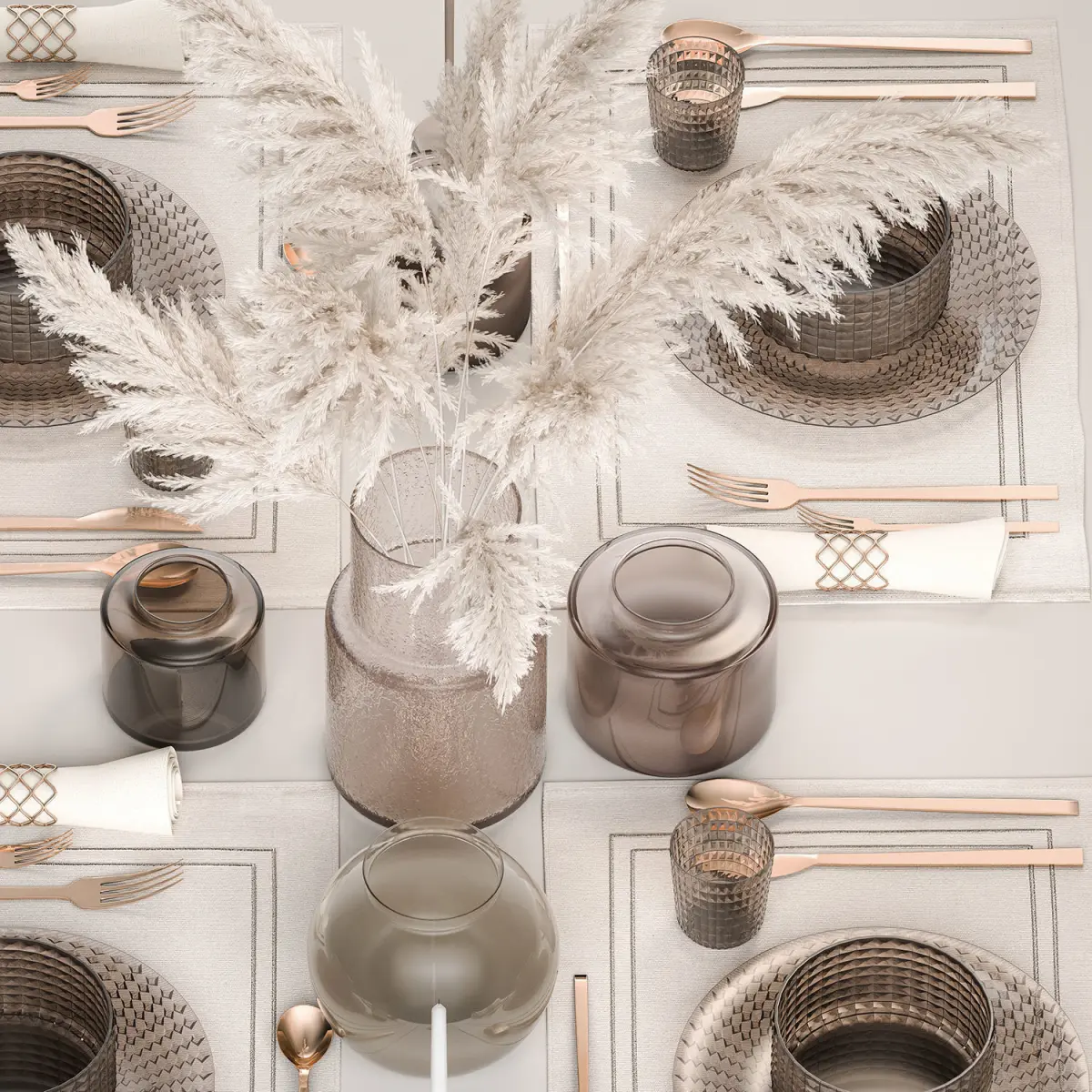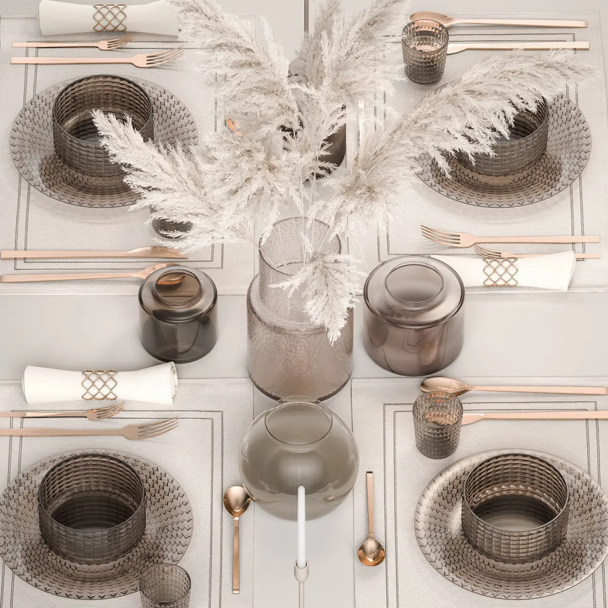 Stylish table setting for 4 persons with a bouquet of white pampas grassSolemn table setting in eco style from reeds and natural decor.ZARA HOME, ikeabranches,Glass vase ikea, IKEA, KONSTFULLDry reed - Dry white reed.Dried flower, dry grass.dry, stabilized, paintedCortaderia, pampas, pampas grass