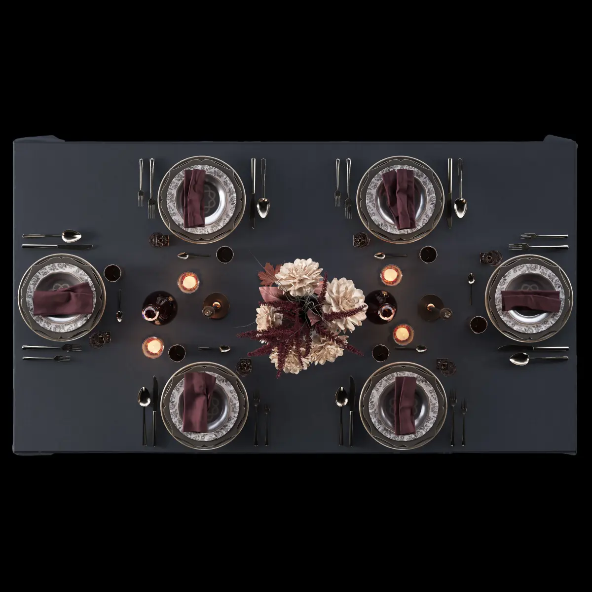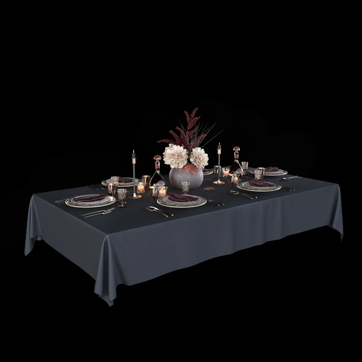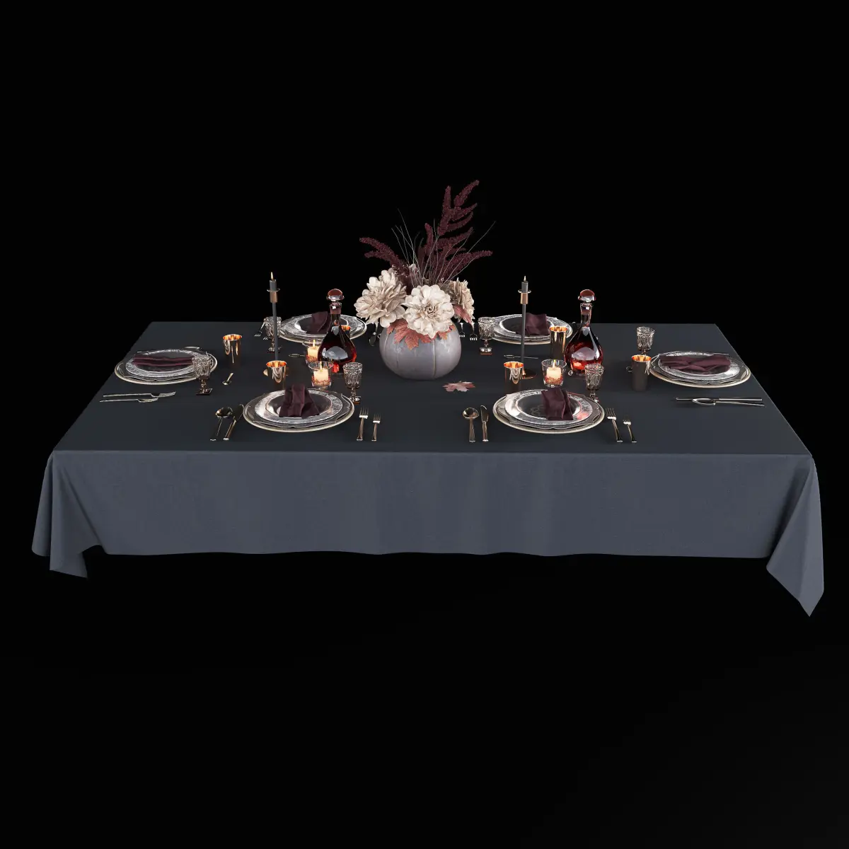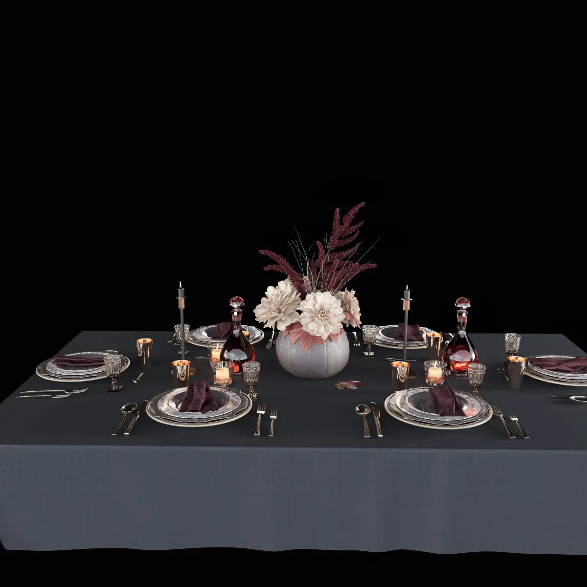 Photorealistic high-quality 3D model of autumn-themed table setting with flowers, leaves, and candles decoration.