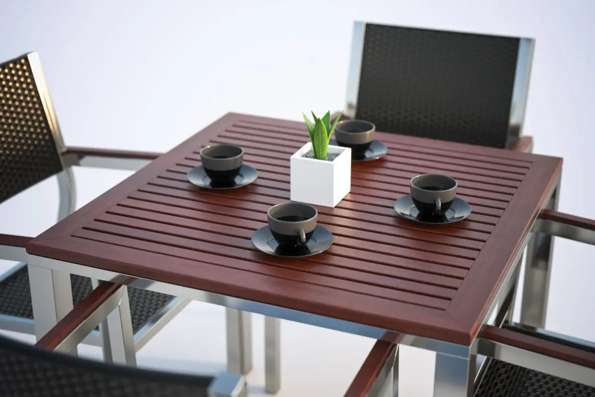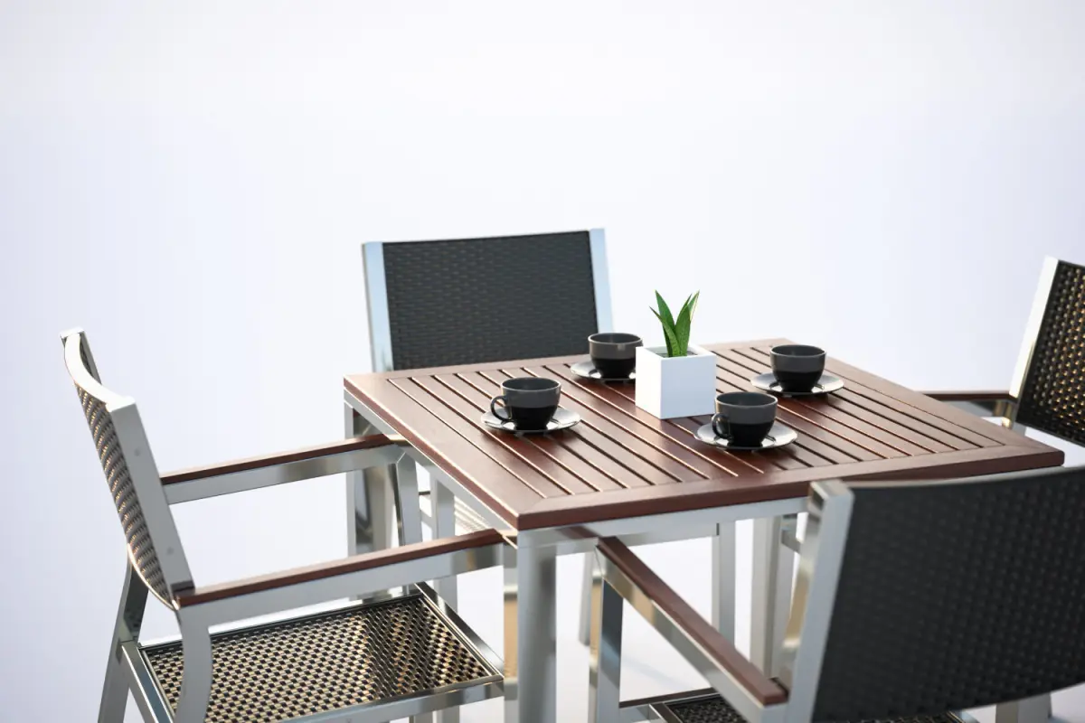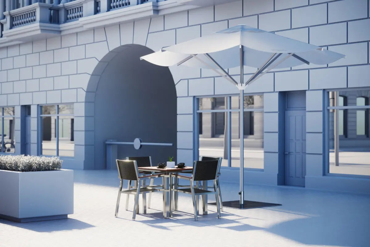 This high quality model includes the table with four modern metal chairs standing under a huge umbrella. Next to the concrete pot with plants.Model prepared for 3d architectural visualisations and other graphic works.