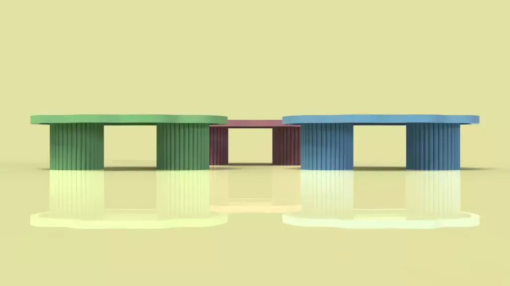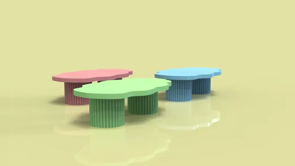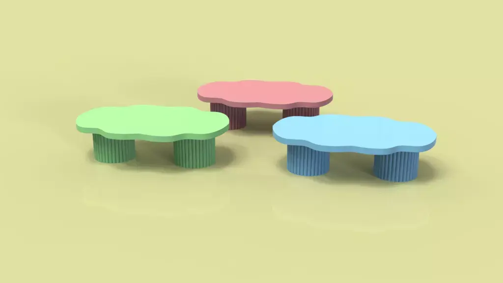 Bring imagination to life with these dreamy cloud-shaped kids tables, each perched atop vibrant ribbed pillars that resemble magical stilts from a fantasy world. The trio includes: