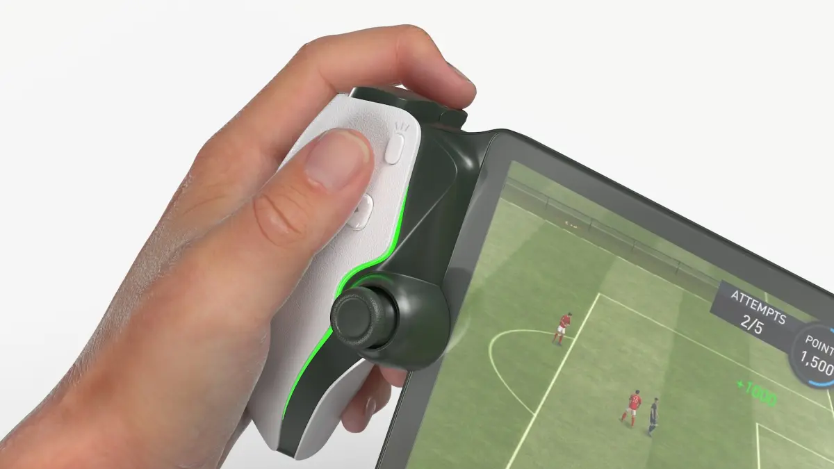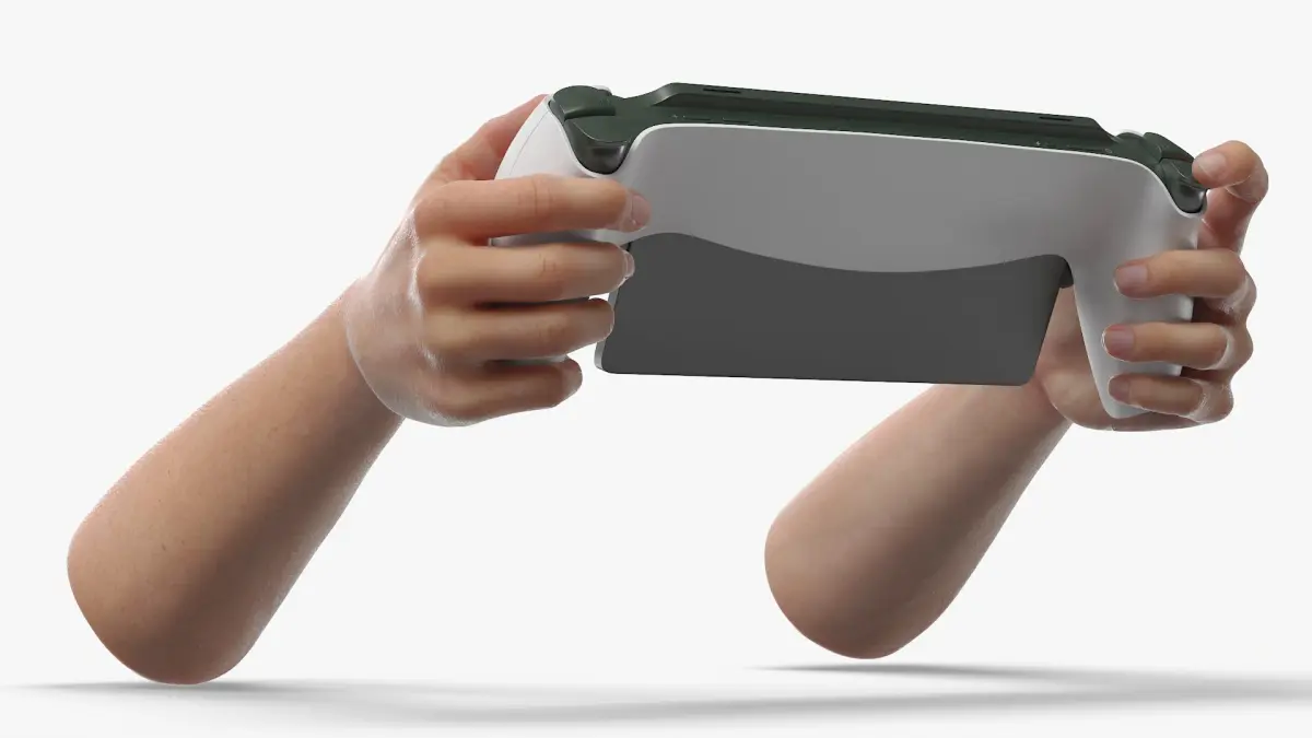 Tablet Gaming Console with Controllers in Hands is a three-dimensional model of wireless remote gaming console with LCD display, designed for modern handheld gaming and remote streaming.