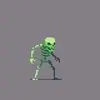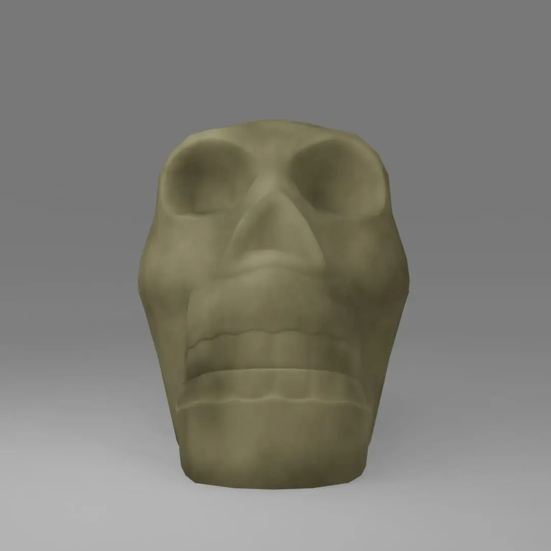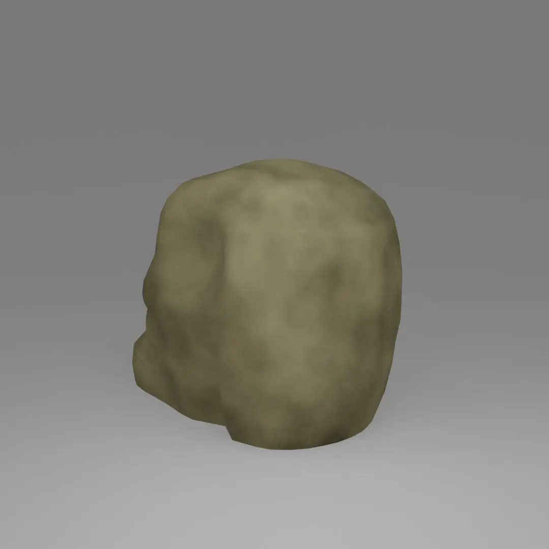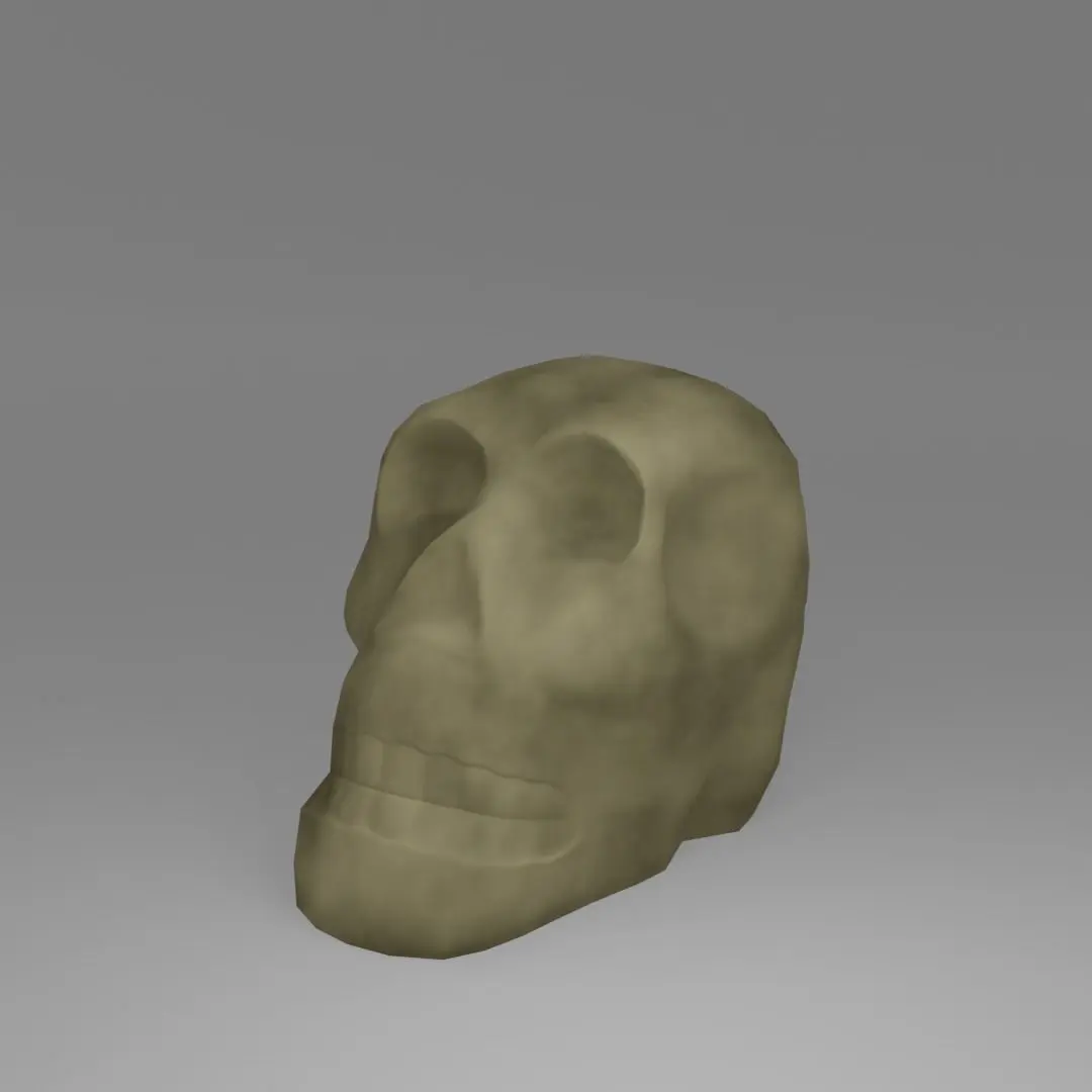 Tabletop figure of a human skull. Small mud texture on the skull. The bottom of the figure is flat, which allows it to stand flat on the surface.