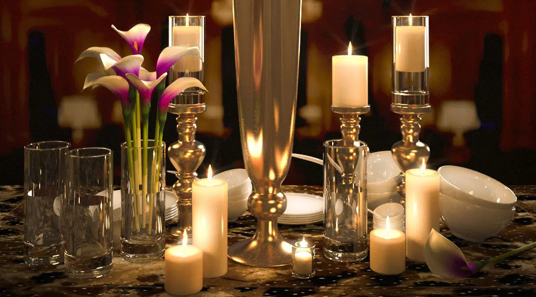 tableware with beautiful calla lilies, candles, tableware, vases and much more..gives an royal beauty for your interiors..completely designed in 3dsmax